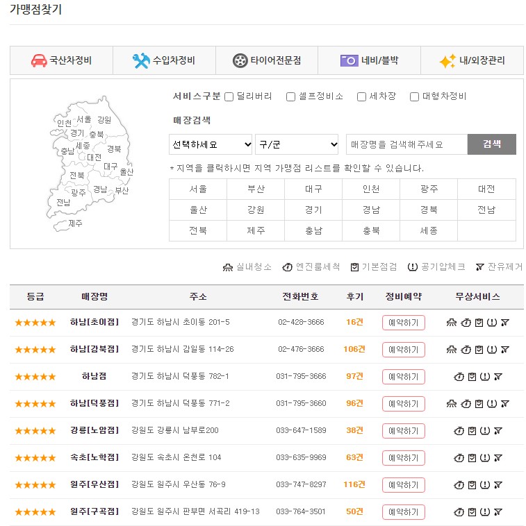 공임나라는 전국에 꽤 많은 곳이 위치하고 있다. 따라서 내 집 혹은 내 사무실에서 가장 가까운 곳을 우선으로 찾아보는 것이 중요하다. 이 때 비슷비슷한 곳이라면 후기가 많고 무상 서비스가 많은 곳을 선택하는 것이 좋다. 가장 가깝고 괜찮은 곳을 찾았다면 예약하기로 예약을 하면 되는데 이 때 전화로는 예약이 불가하기 때문에 참고를 해야 하며 일부 업체에서는 딜리버리 서비스 및 셀프정비소 그리고 세차장을 함께 운영하는 곳이 있기에 필요에 따라서 체크를 해주면 된다. 또한 대형차 정비가 가능한 곳도 있으니 대형차 정비가 필요한 사람이라면 상단에서 체크를 하고 진행하면 된다.