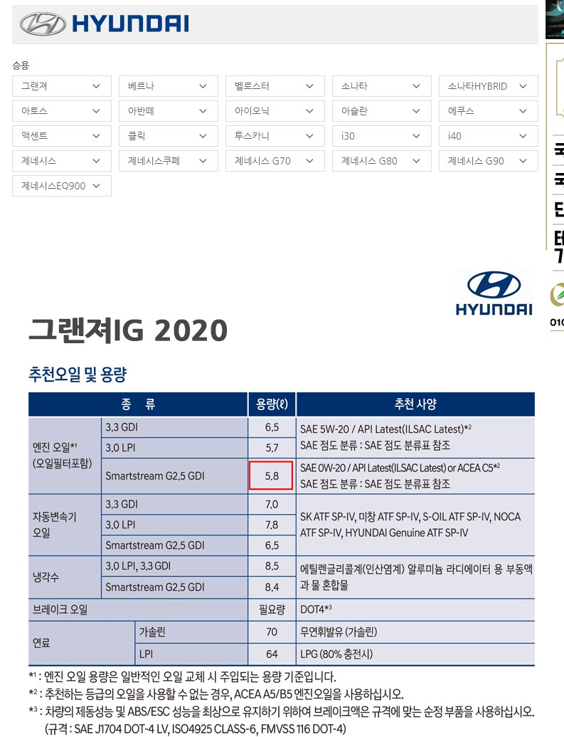 공임나라에서는 국산차량의 엔진오일 규격과 용량을 알려주는 부분도 있으니 잘 찾아보면 좋다. 합성 엔진오일을 구매하는 경우 내 차량과 호완되는지 살펴봐야되는데 엔진오일의 추천 사양을 보고 규격에 맞춰서 구매하는 것도 중요하다. 보통 엔진오일 5.8L 같은 경우 엔진오일 6리터를 구매하는 것이 좋겠지만 실제로 교환 시 보통은 5L 조금 더 들어가는 수준이다. 따라서 처음에는 6리터를 구매하고 1리터가 남는다면 다음에는 5리터를 구매하고 엔진오일 첨가제를 구매하는 것도 하나의 방법이다.
