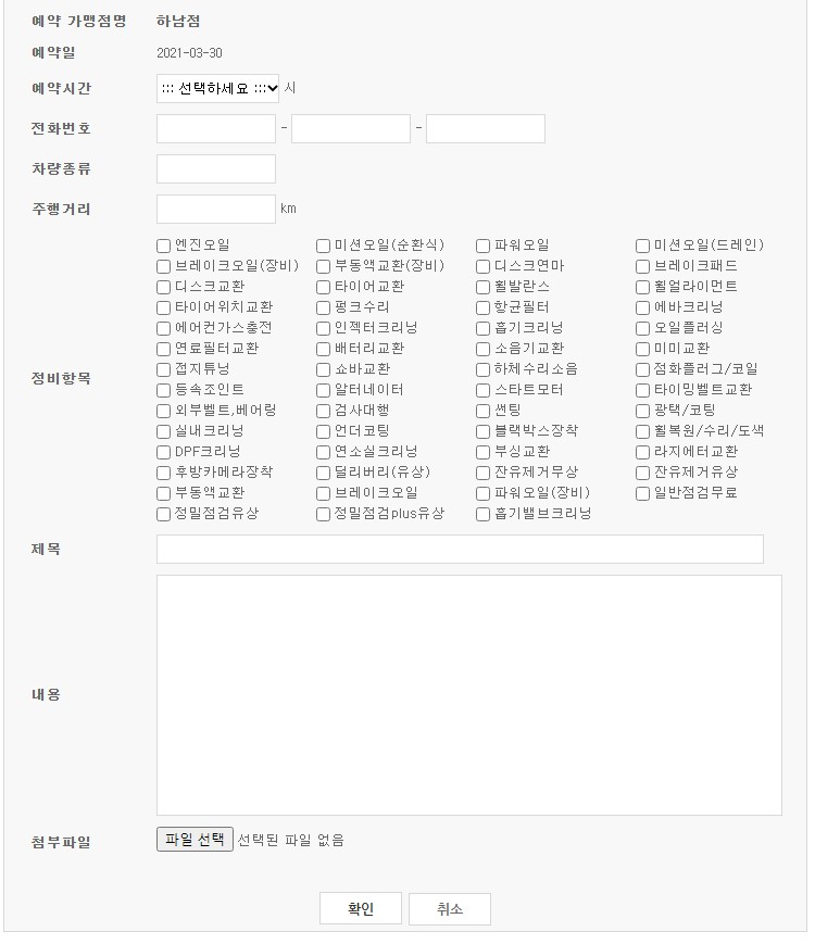 내가 원하는 날짜와 시간이 있다면 이제는 정비 항목과 차량 정비 내역에 대해서 적어주면 된다. 특히나 엔진오일이나 미션오일 혹은 자동차 부품 교환 작업을 원한다면 엔진오일은 가지고 가는지 엔진오일 필터 및 에어필터 교체를 할 것인지 아니면 내가 부품을 가져갈지를 정확하게 적어주는 것이 중요하다. 덤으로 엔진오일 첨가제를 오일 교환 시 넣어달라고 하신다면 추가 요금 없이 대부분 교체해주신다. 엔진오일을 가져가고 오일 필터와 에어필터를 업체에서 구입해서 교환하는 경우 평균 3만 원정도의 공임 비용이 나온다.