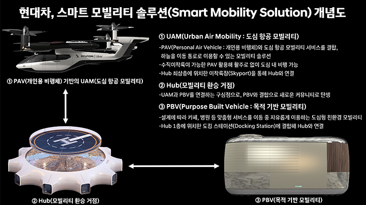현대자동차에서는 스마트 모빌리티 솔루션을 제안했는데요. 우선 UAM (Urban Air Mobility)로 도심 항공 모빌리티를 제안했습니다. 쉽게 이야기하여 PAV (개인 비행체)를 활용하여 활주로 없이 수직 이착륙으로 도심을 주행할 수 있는 기술로 특히나 막히는 서울 같은 곳에서는 유용하게 이용이 가능합니다. 이런 UAM 도심 항공 모빌리티가 진행되려면 HUB (모빌리티 환승 거점)이 필요한데요. 이는 UAM과 PBV를 연결하는 곳으로 자동차가 없어도 이동하기 편리한 하나의 도심 터미널로 생각하시면 됩니다. 여기에 PBV 목적 기반 모빌리티는 단순히 이동 수단이 아니라 자유롭게 목적지를 이동하면서 병원 검진을 받거나 혹은 카페 또는 음악이나 영화를 감상할 수 있는 다양한 서비스를 이동 중에 이용할 수 있습니다.
