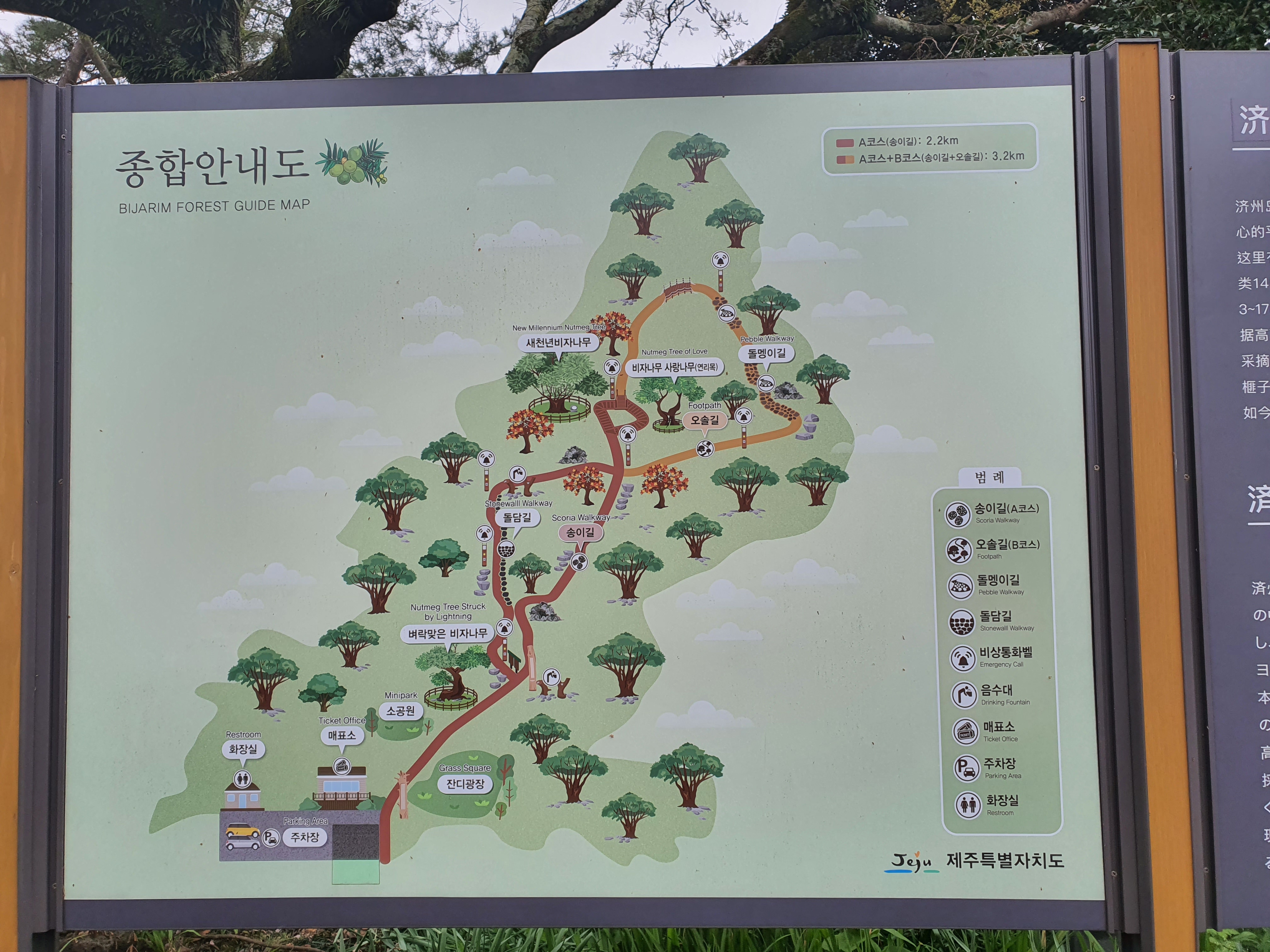 탐방 코스는 기본 1.8km 정도로 생각하시면 됩니다. 여기에 추가로 돌맹이 길까지 다녀오신다면 약 1km정도 추가 된다고 생각하시면 되기 때문에 빠른 걸음으로 비자림 소요시간을 결정한다면 대략 20분내로도 감상이 가능하며 전체 코스를 모두 돌아보신다면 3km 정도 수준으로 천천히 1시간 정도면 충분히 돌아볼 수 있는 코스입니다.