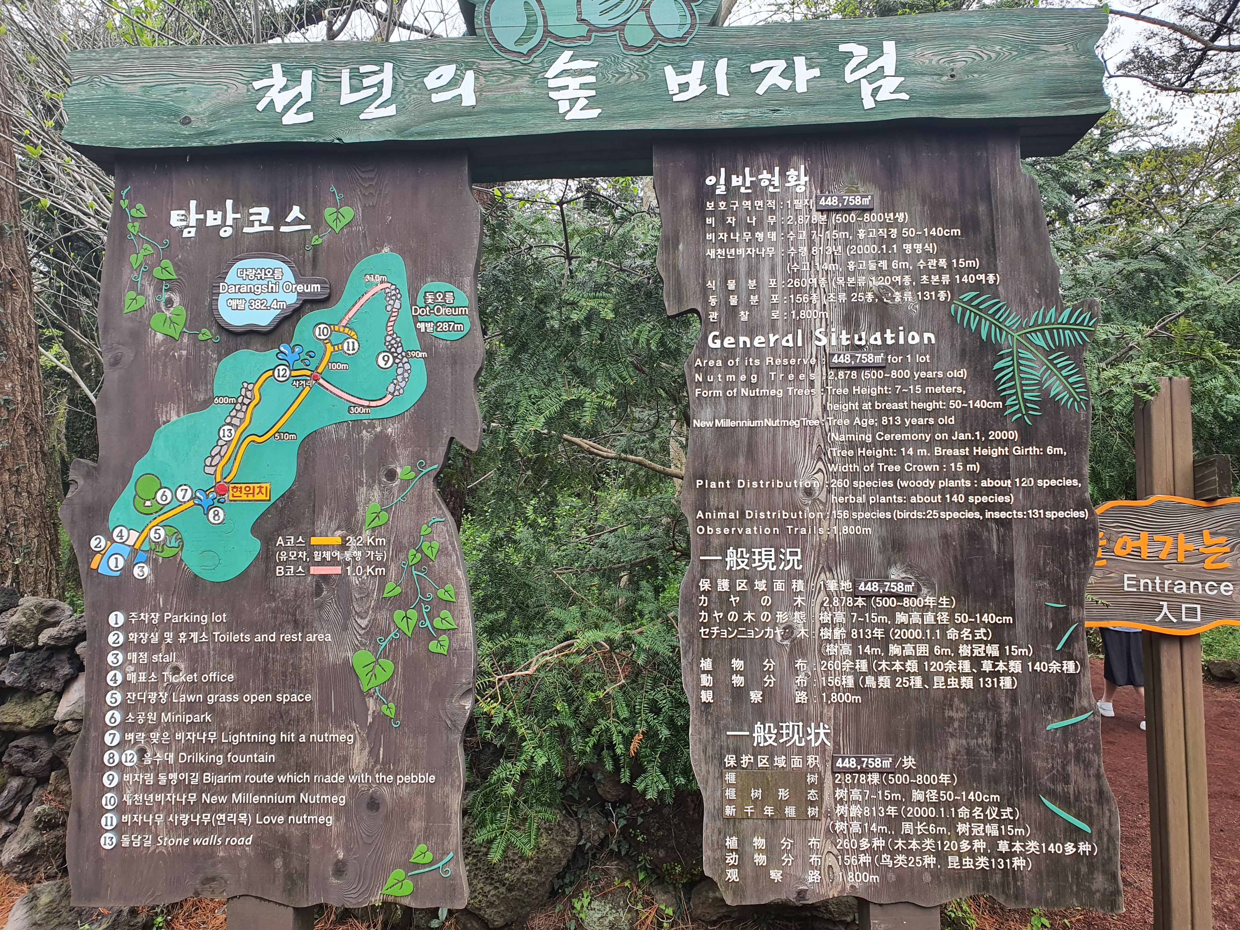 코로나 19로 인하여 비자림 관람에는 인원 제한이 있기 때문에 이 곳을 방문하시려면 아침 일찍 방문하셔야 합니다. 오후에 가셨다가 인원 제한으로 입장 시간이 남았지만 입장을 못하실 수도 있습니다. 보통 제주도 비자림 소요시간은 걷는 걸음에 따라 다르지만 산책한다고 생각하고 걸으면 대략적으로 30~40분정도이며 A코스와 B코스로 나뉘어져 최대 1식나 30분정도까지 생각을 하시면 됩니다.