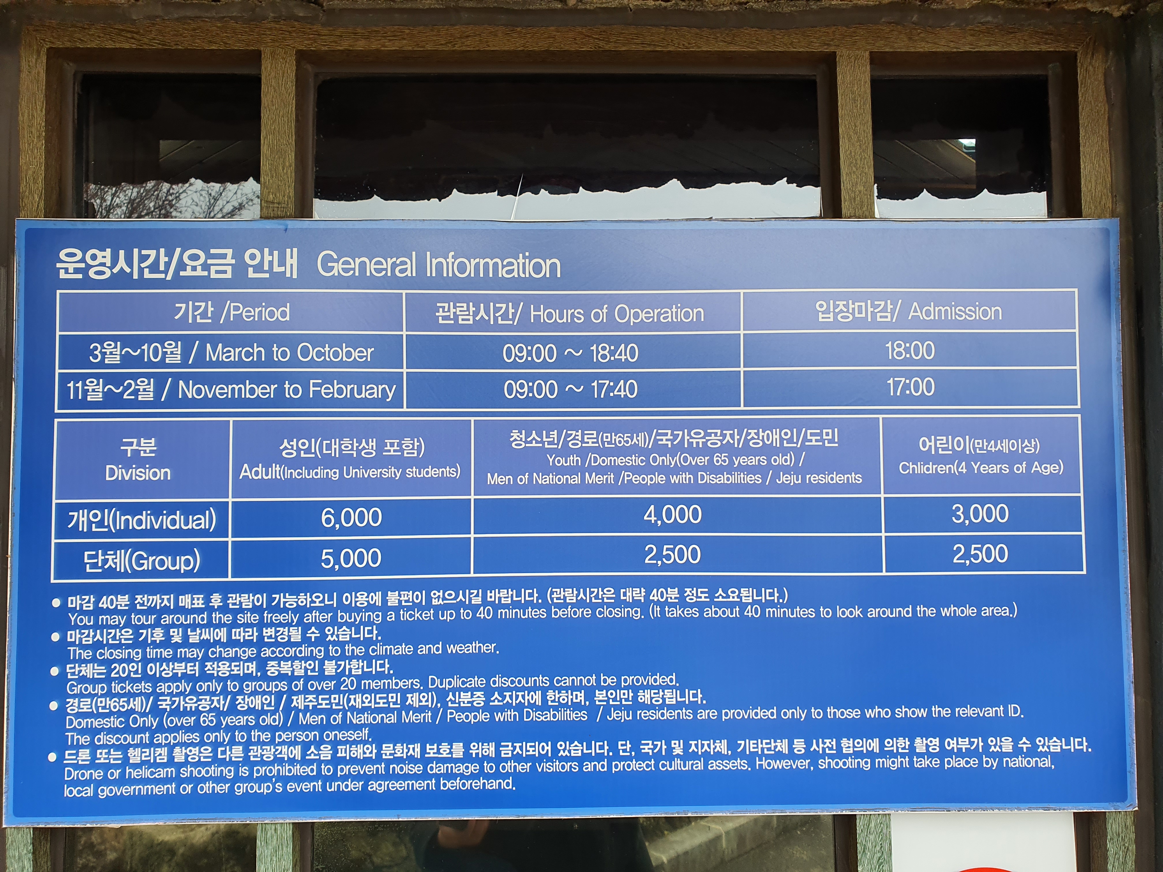 제주도 산굼부리 입장료는 조금 비싼 편입니다. 성인 기준으로 6,000원이며 어린이 3,000원 정도입니다. 관람식나은 오전 9시부터 오후 6시까지인데요. 어짜피 해뜨는건 못보니깐 해지는거 보러가는 것도 좋을거 같기도 합니다. 대략적으로 관람시간은 40분정도 소요가 된다고 합니다.