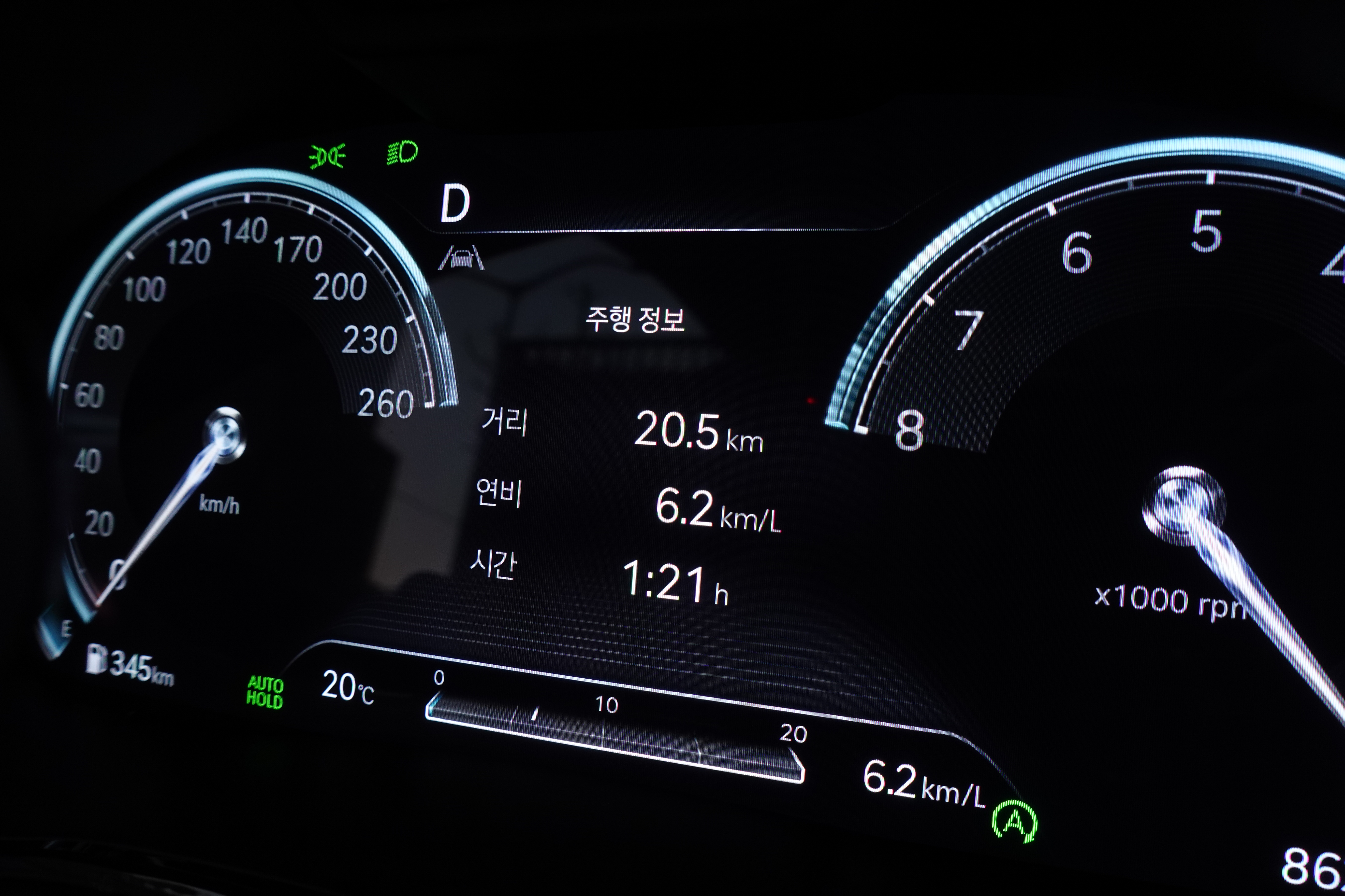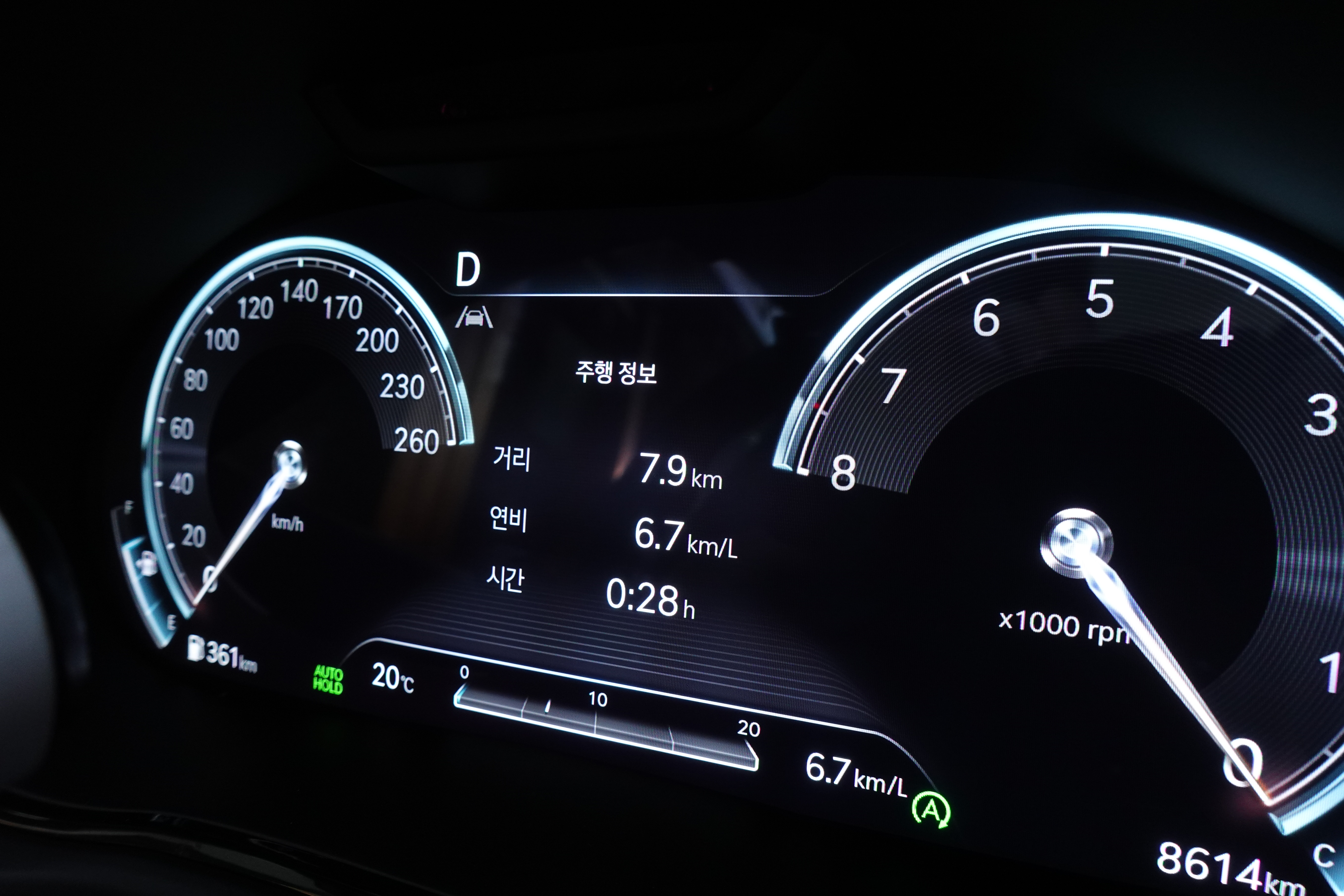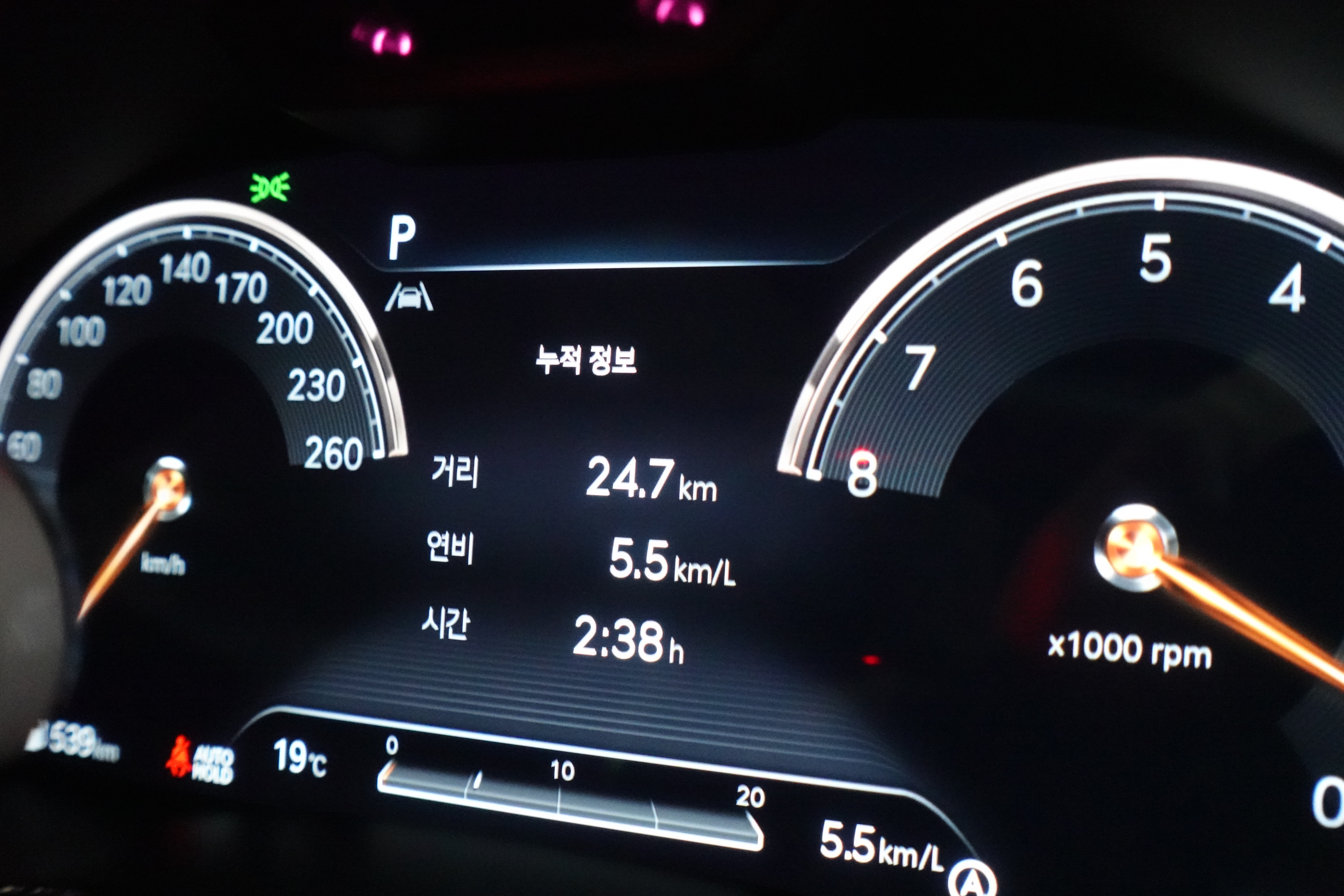 고속도로에서 24.7km를 주행한다면 대략적으로 20분정도면 도착하겠지만 강남의 퇴근길을 뚫고와서 그런지 꽤 많이 막혔습니다. 특히나 2.5 가솔린 터보 모델은 금요일에 테스트를 해서 그런지 정말 많은 정체를 보여줬으며 총 2시간 38분이 소요되어 5.5km/L라는 연비를 보여줬습니다.