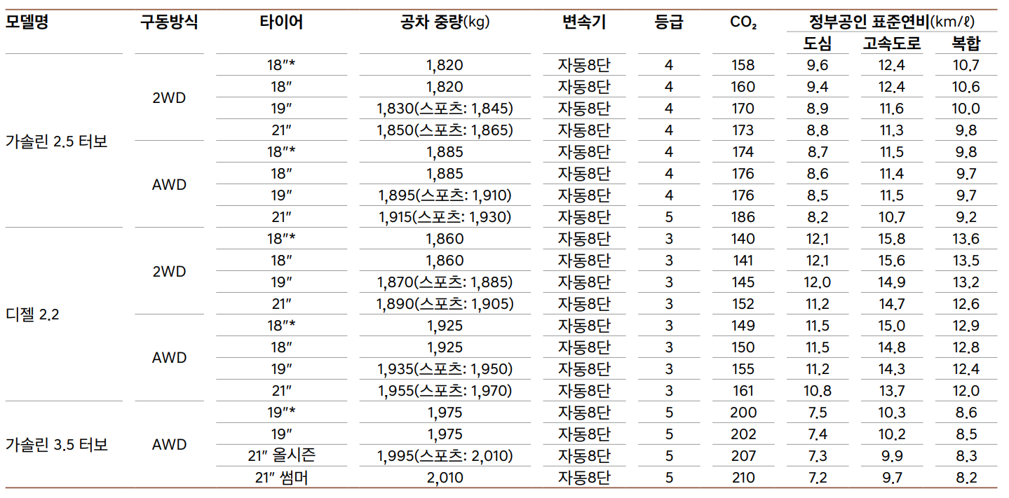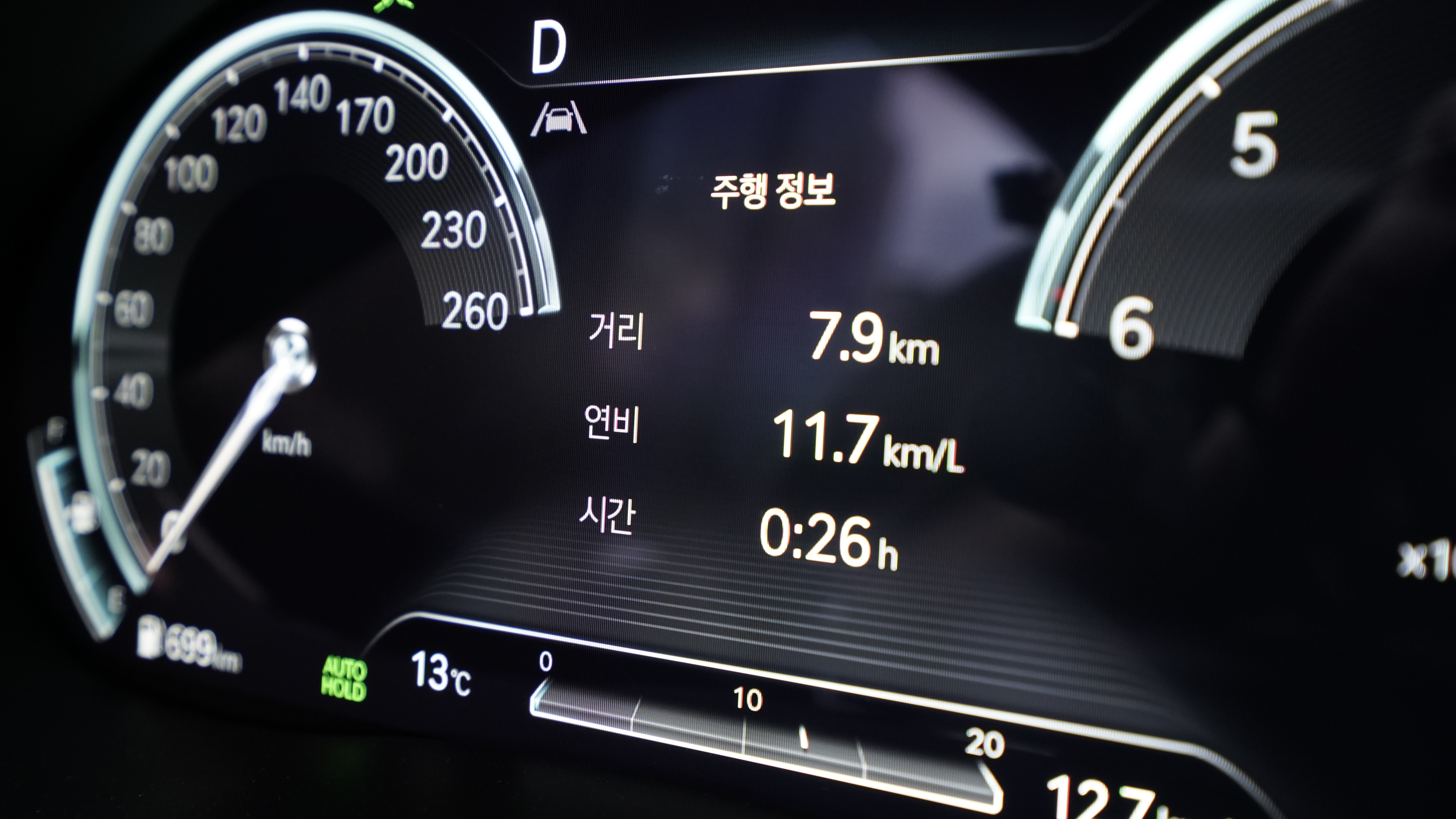 2.5 가솔린 터보 모델은 20.3km/L 주행하는데 2시간 17분 걸려 5.3km/L를 보여줬으며 3.5 가솔린 터보 모델은 동일한 구간 1시간 21분 걸려서 6.2km/L를 보여줬습니다. 디젤 모델은 비슷한 1시간 23분 걸려 연비 11.6km/L로 여전히 두 자리 숫자의 연비를 보여줬습니다.