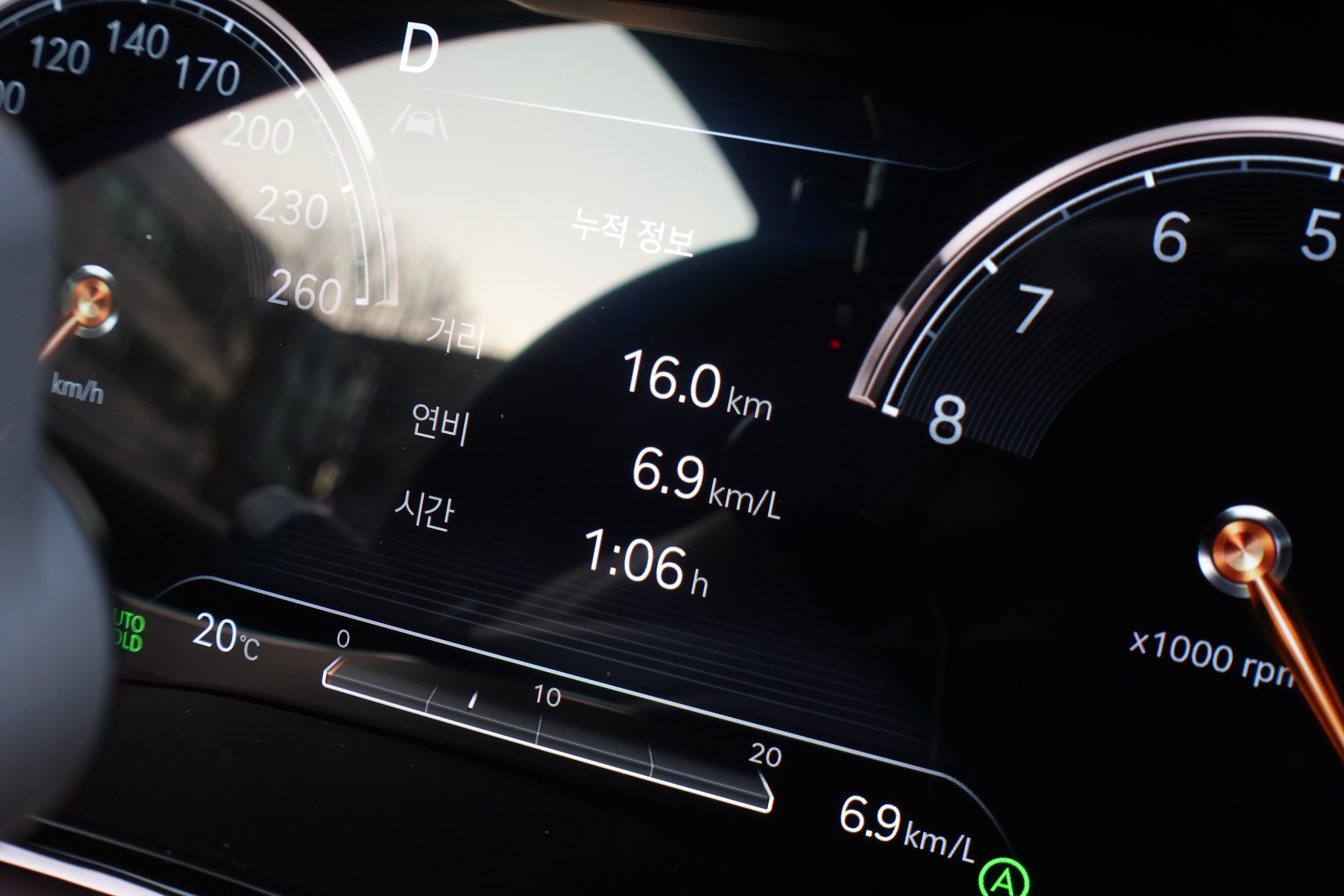 교대역에서 삼성역까지는 대략적으로 3.2km로 멀면 멀지만 가까우면 가까운 거리로 지하철로 4정거장 밖에 되지 않은 짧은 구간입니다. (2호선 구간 사이가 좀 짧은 편이죠) 동일한 16km 구간에서 2.5 가솔린 터보 모델은 1시간 6분 소요가 되어 6.9km/L의 연비를 보여줬고 3.5 가솔린 터보 모델은 54분 소요되어 동일한 6.9km/L 연비를 보여줬습니다. 실제로 2.5 가솔린 모델이 연비가 훨씬 좋다? 그러 느낌은 아닙니다. 안 달리면 비슷한 수준입니다.