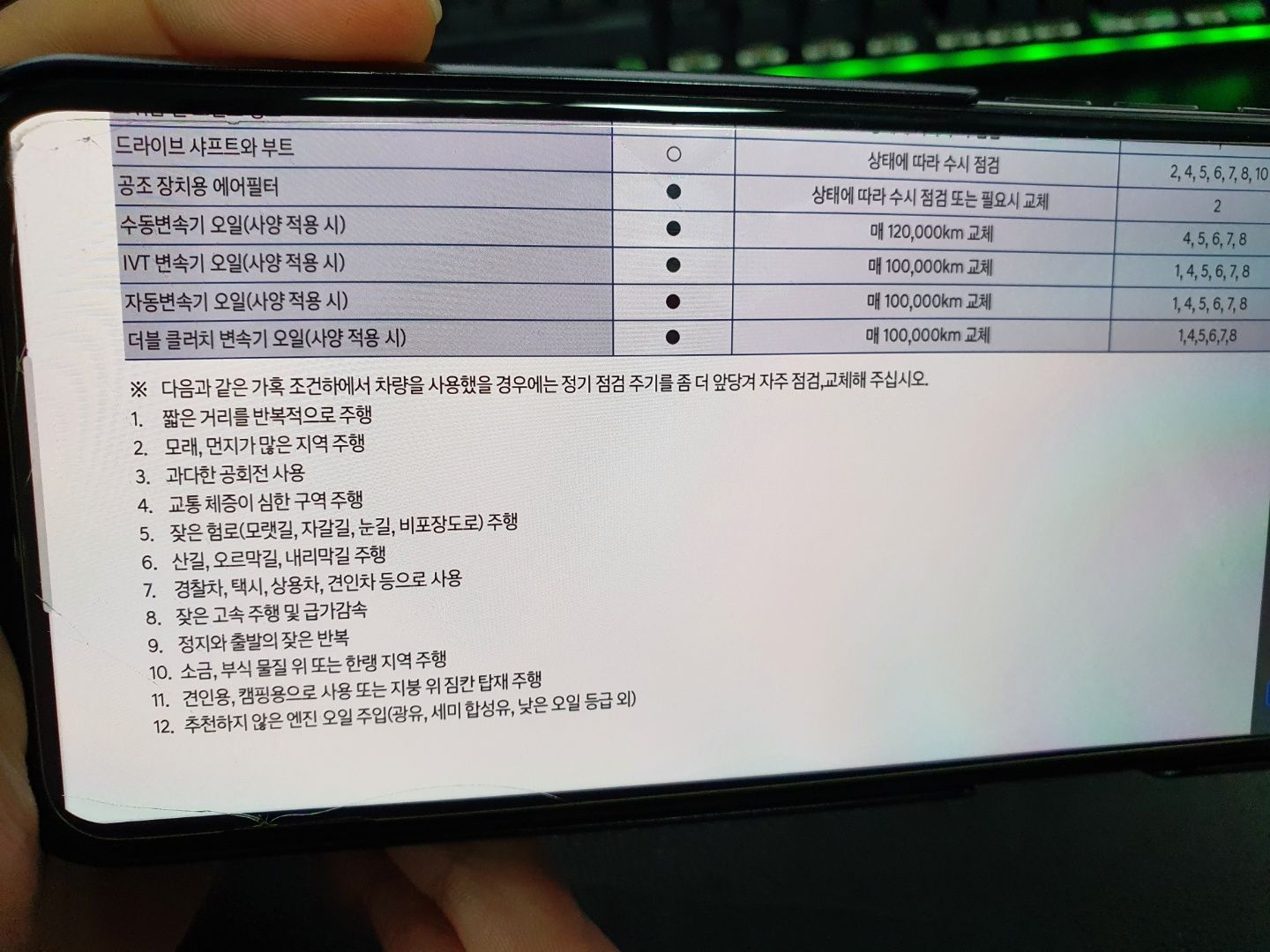 가혹조건??? 난 차를 험하게 다루지 않는데?? 라고 생각하는 운전자들이 상당히 많지만 현재자동차가 제시하는 가혹조건을 살펴보면 생각보다 해당하는 사항이 많습니다. 우선 짧은 거리를 반복적으로 주행은 집 앞 마트를 다니거나 혹은 아이 학원 및 학교 등하교 시에도 포함됩니다. 또한 교통 체증이 심한 구역 주행은 막히는 도심도로에서 출퇴근만 하더라도 해당사항이 되는 부분이며 산길 / 오르막길 / 내리막길 주행 또한 집이 언덕에 있다면 자주 오르막길을 오르게 됩니다. 또한 잦은 고속 주행 및 급가속과 급감속이 많은 경우에도 해당되기 때문에 미션오일 교환 주기는 적어도 한국에서는 무교환이 절대 아닙니다.