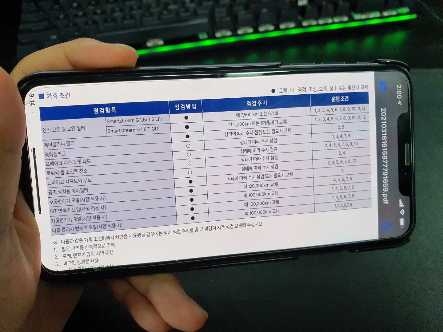 가혹조건??? 난 차를 험하게 다루지 않는데?? 라고 생각하는 운전자들이 상당히 많지만 현재자동차가 제시하는 가혹조건을 살펴보면 생각보다 해당하는 사항이 많습니다. 우선 짧은 거리를 반복적으로 주행은 집 앞 마트를 다니거나 혹은 아이 학원 및 학교 등하교 시에도 포함됩니다. 또한 교통 체증이 심한 구역 주행은 막히는 도심도로에서 출퇴근만 하더라도 해당사항이 되는 부분이며 산길 / 오르막길 / 내리막길 주행 또한 집이 언덕에 있다면 자주 오르막길을 오르게 됩니다. 또한 잦은 고속 주행 및 급가속과 급감속이 많은 경우에도 해당되기 때문에 미션오일 교환 주기는 적어도 한국에서는 무교환이 절대 아닙니다.
