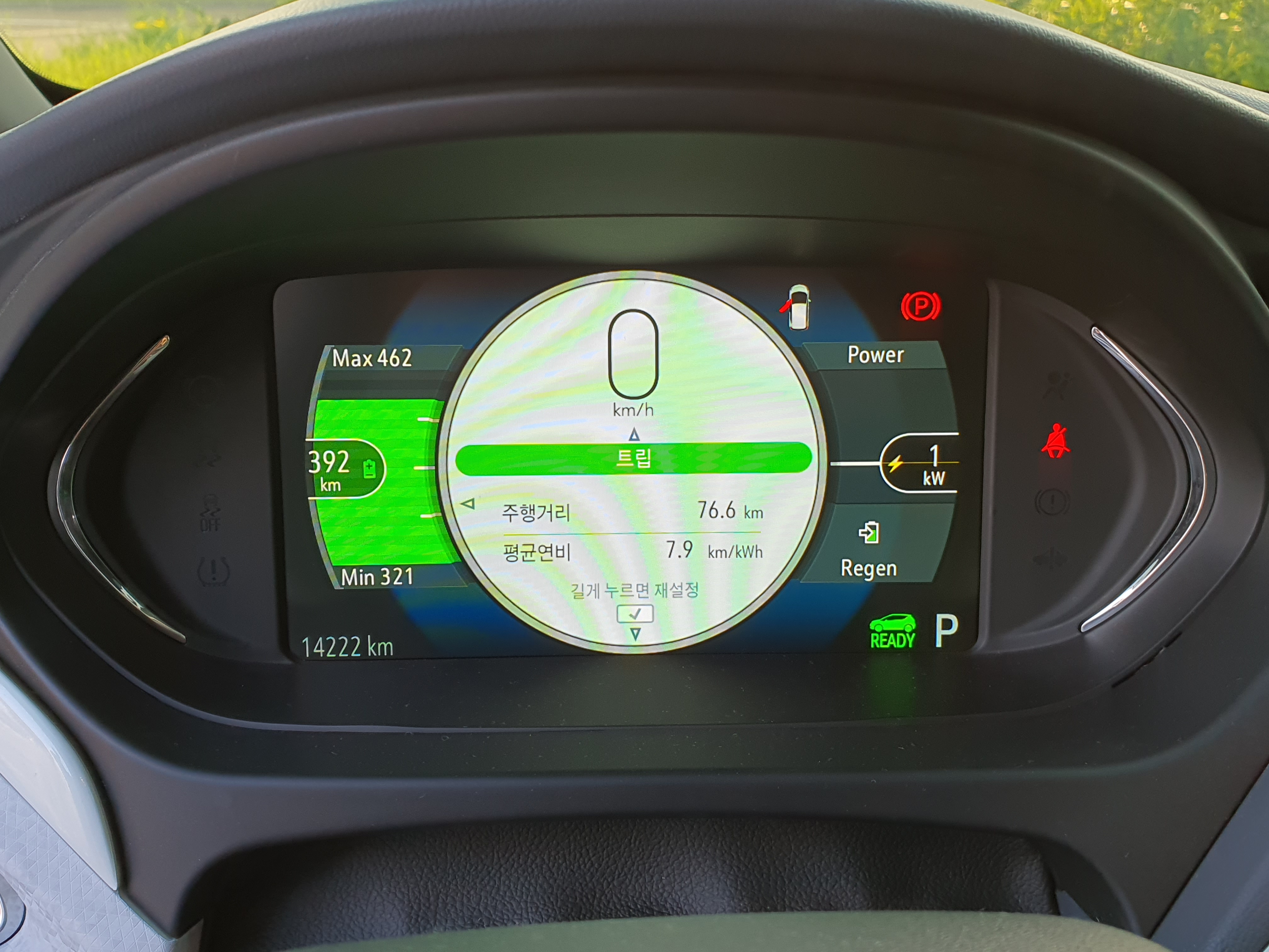 쉐보레 볼트EV의 총 주행 가능거리는 최대 462km / 최소 321km 주행이 가능했으며 운전자의 주행방식을 체크하여 80% 충전에 392km 주행이 가능했다.