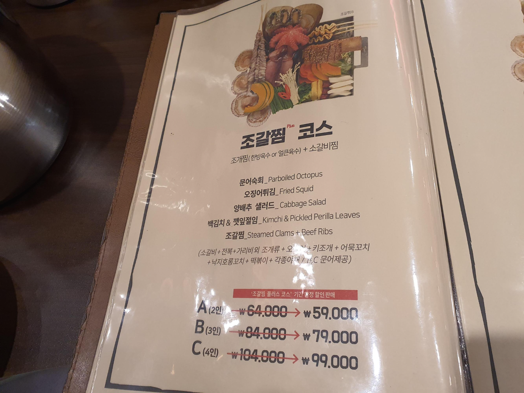 개인적으로 이 곳에서 추천하는 메뉴는 조개찜과 갈비찜을 한 번에 먹을 수 있는 조갈찜 코스이다. 조갈찜 코스는 조개찜에 한방육수 혹은 얼큰육수로 국물도 함께 먹을 수 있으며 소갈비찜에 문어숙회, 오징어튀김이 함께 나오는 메뉴로 1인 기준 약 2만 5천원 ~ 3만원 정도로 생각보다 가성비도 좋은 메뉴를 판매하고 있다.