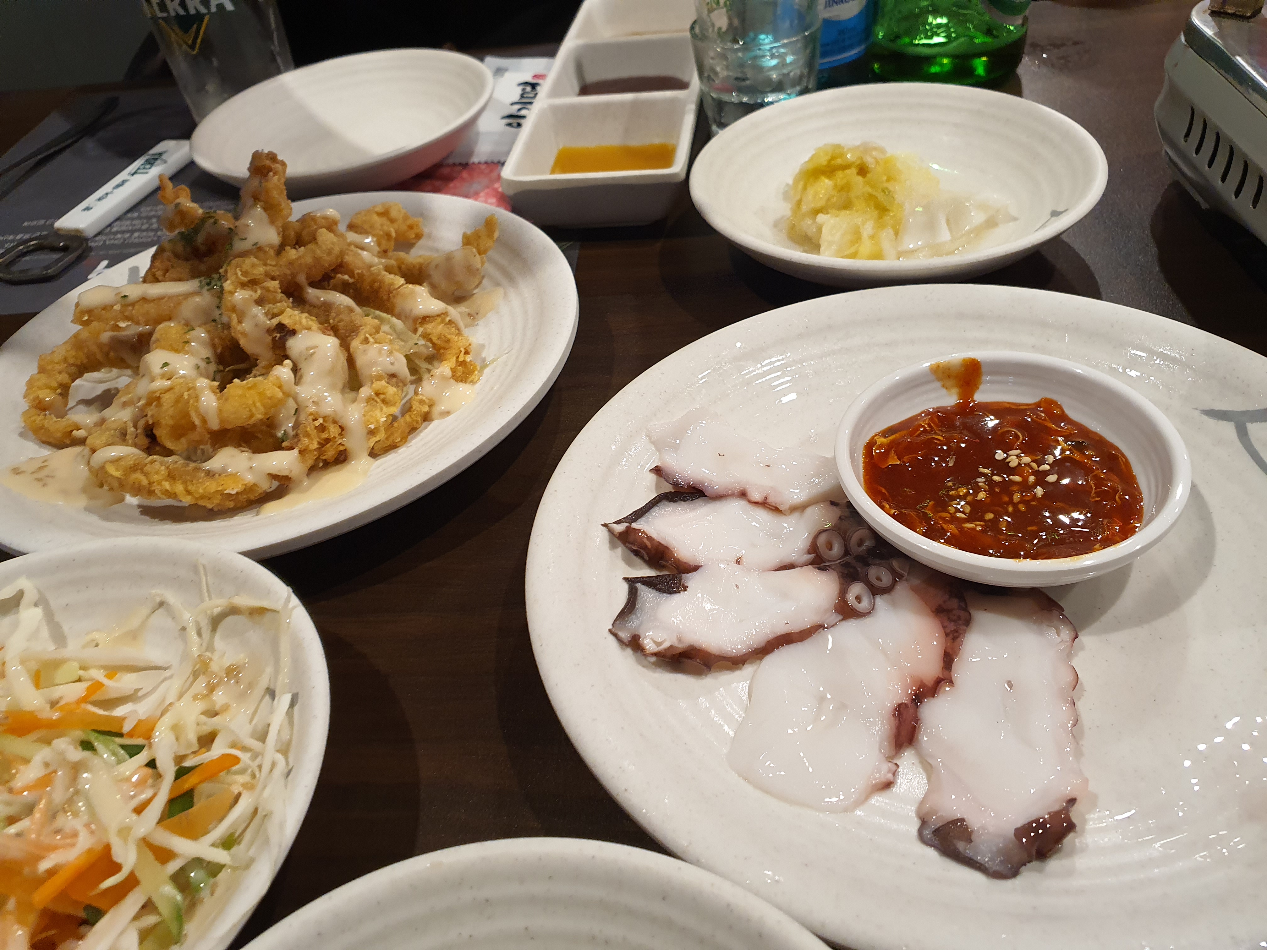 조갈찜 (조개찜 + 갈비찜)을 시키면 메인 메뉴가 나오기 전에 문어숙회와 오징어튀김이 나온다.