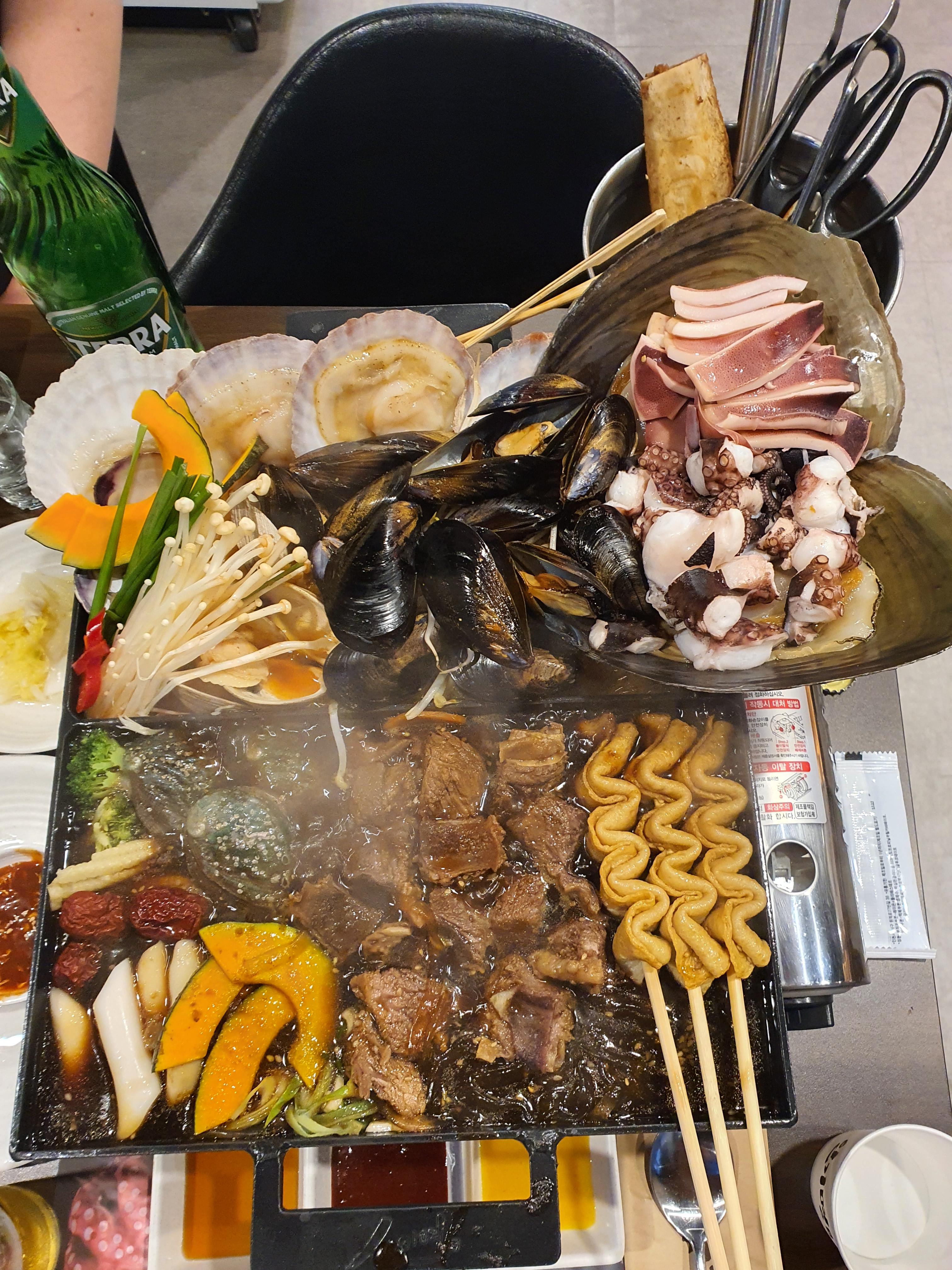 절반으로 나뉘어진 철판에 한 쪽에는 전복과 호박 그리고 대추와 떡 그리고 소갈비와 어묵이 꼬치로 구성되어 있는 전형적인 소갈비찜을 보여주고 다른 한쪽에는 매콤한 육수에 키조개, 오징어, 문어, 가리비, 동죽, 낙지호롱 등 다양한 해산물을 한 번에 먹을 수 있는 구성으로 되어 있다.