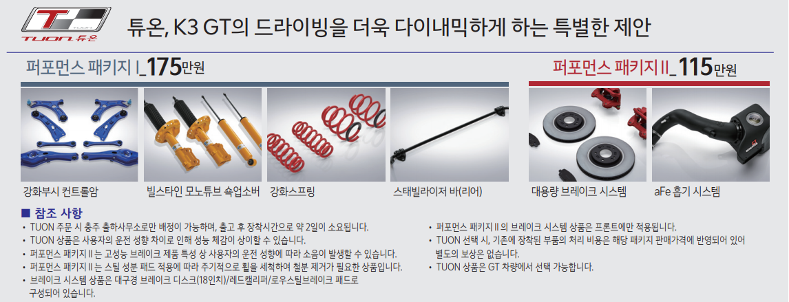 튜온 퍼포먼스 패키지 175만 원에는 강화부시 컨트롤암 독일 빌스테인 모노튜브 쇽업쇼버, 강화스프링, 스태빌라이저 바 를 선택할 수 있어 애프터 마켓보다 저렴하게 장착 가능하며 퍼포먼스 패키지 II 는 115만원으로 aFe흡기 시스템과 대용량 브레이크를 선택할 수 있어 대중적인 스포티함을 한층 넘어설 수 있는 파츠를 선택할 수 있다.