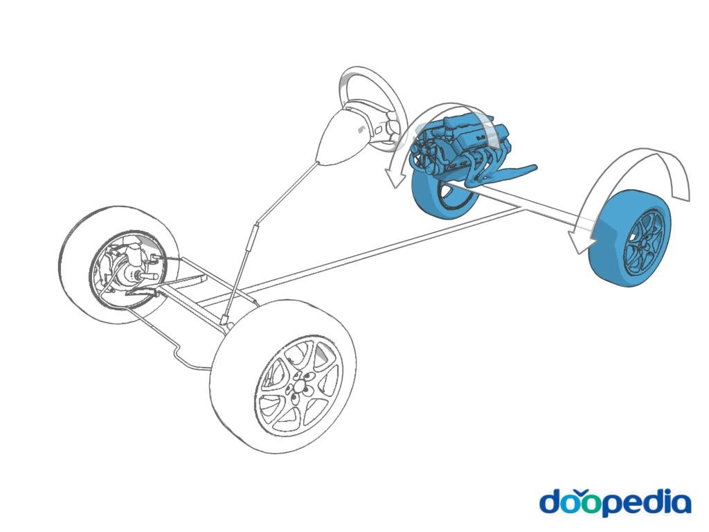 엔진에서 나오는 힘이 앞바퀴로 바로 전달 되어 조향과 구동을 같이 하는 방식이기 때문에 뒷바퀴를 위한 별도의 구동축이 필요하지 않다. (구동축=추진축: 앞쪽에 있는 기관 등에서 뒤 차축에 회전력을 전달하는 축을 말하는 것) 이로 인해 다양한 장점들이 생기는데