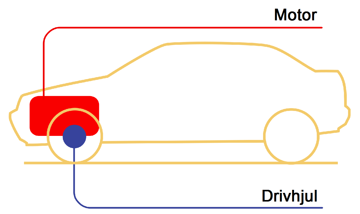 전륜 구동방식의 경우 기관은 앞차축의 전방, 바로 위 또는 후방에 설치된다. 기관, 클러치, 변속기, 종감속/차동장치는 단일 블록을 형성한다.