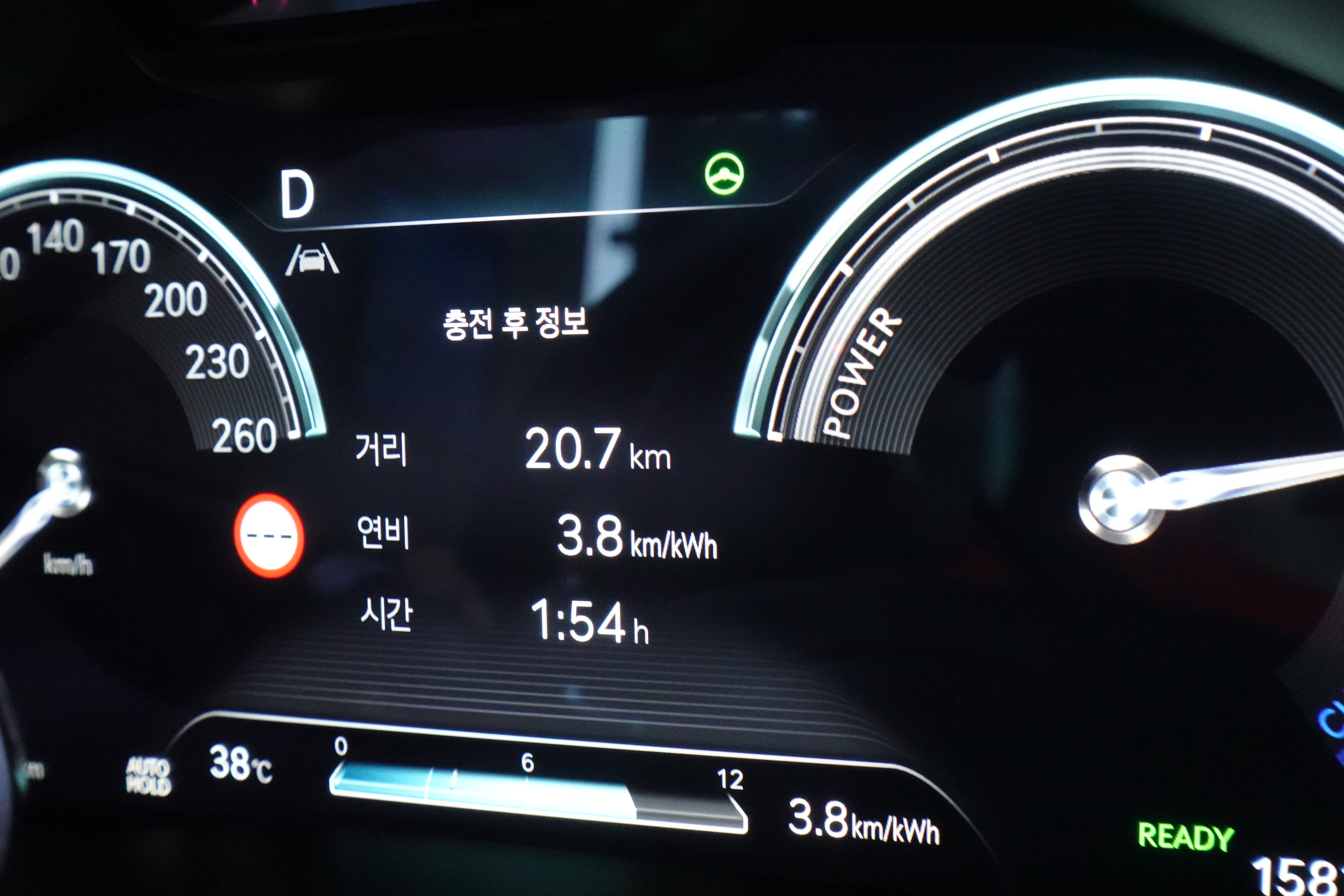 역삼역에 도착을 했을 때 연비는 18.5km 주행을 했으며 1시간 8분 소요가 되어 연비 4.4km/kWh를 보여줬으며 역삼역에서 삼성역까지 2.3km 주행하는데 퇴근 시간 정체로 인하여 49분이 소요되어 삼성역 20.8km를 도착했을 때 1시간 57분이 소요되어 연비는 3.8km/kWh까지 떨어졌습니다.