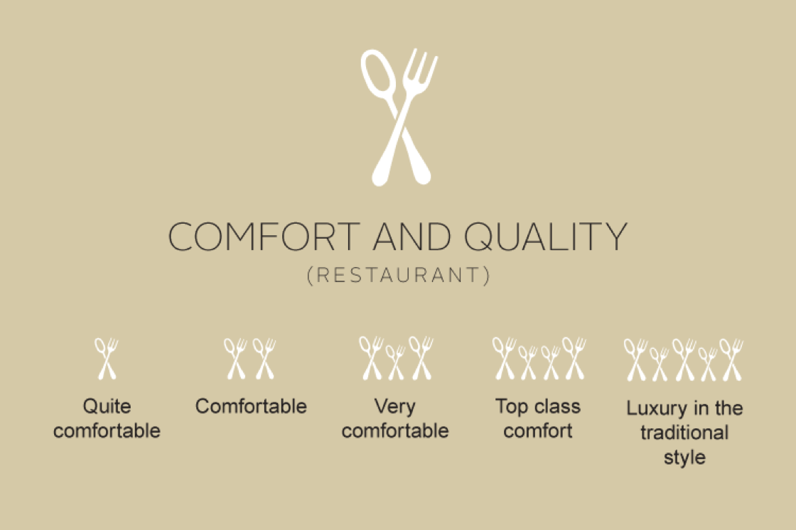 심사 기준은 재료의 품질, 조리기술, 맛을 중점으로 고려해 판단하기 때문에 레스토랑의 장식인 분위기 등은 판단하진 않지만, 편안함과 레스토랑 자체의 품질 면에서 십자형 포크와 스푼 기호를 사용해서 1에서 5까지 따로 평가를 한다.