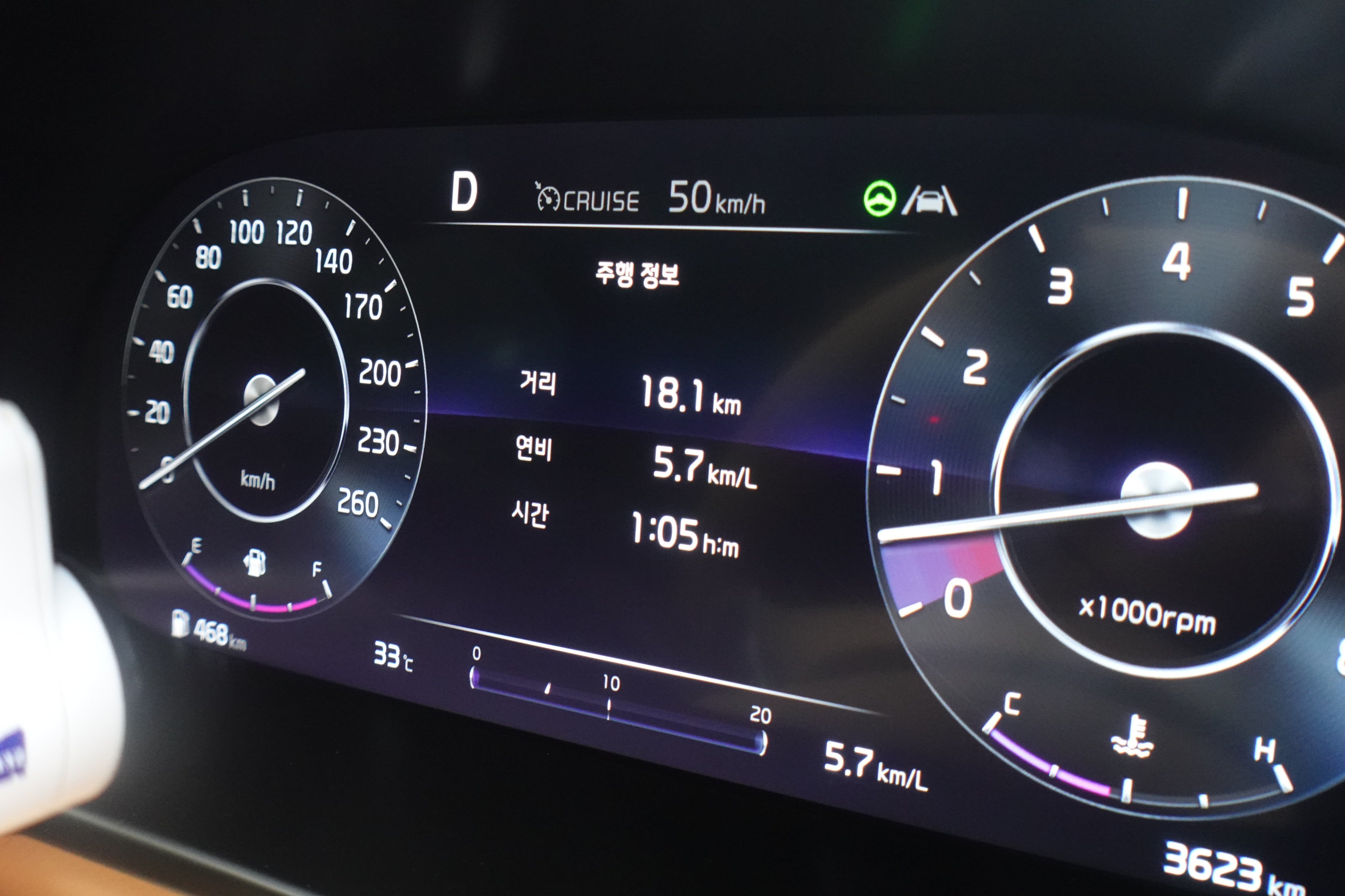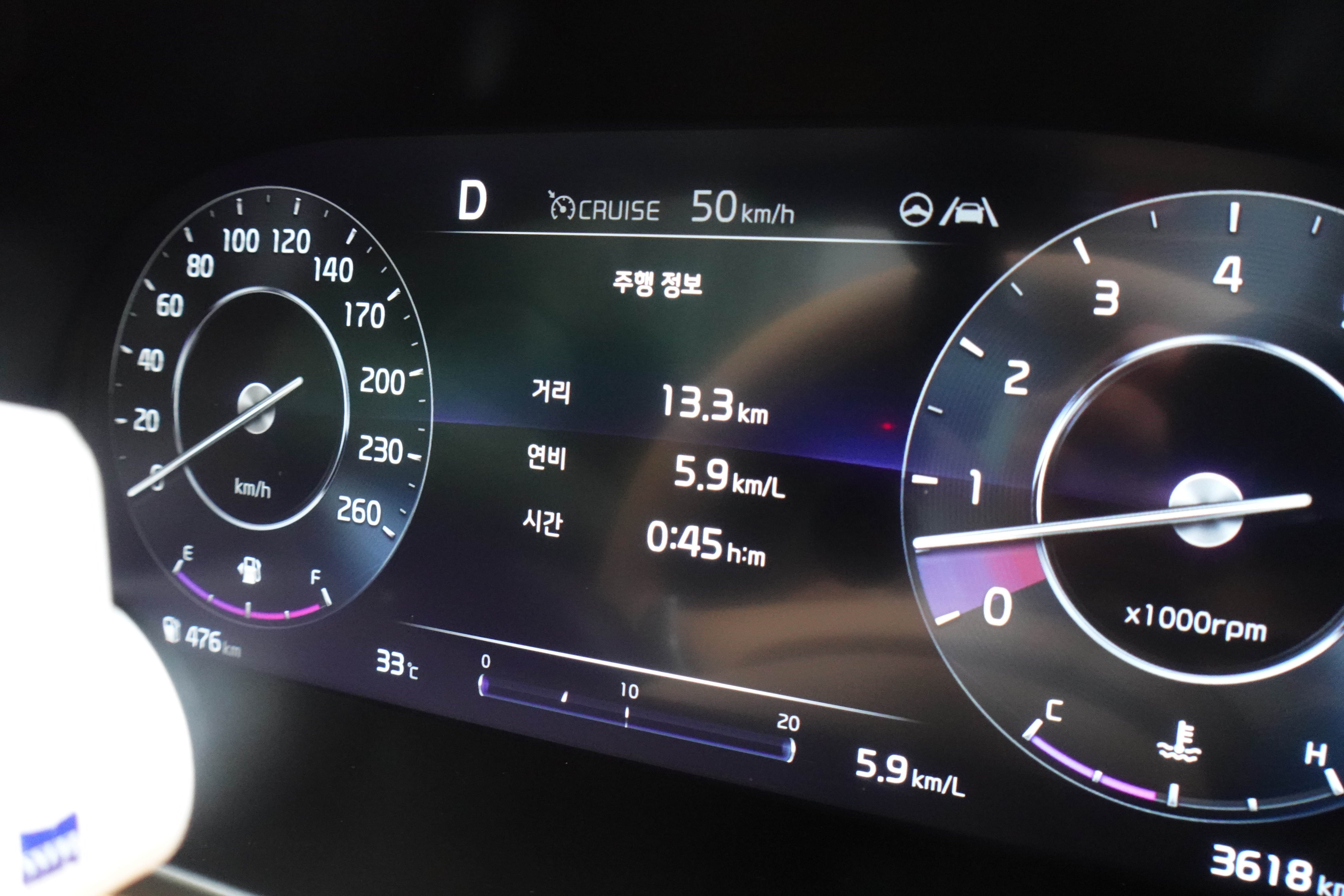 13.5km를 주행하여 방배역에 도착을 했을 때 연비는 5.9km/L를 보여줬다. 총 주행시간은 45분으로 그렇게 많은 정체를 보여주지 않았으며 제네시스 G80 3.5가솔린 터보 모델은 7.2km/L의 연비로 41분 소요되었으며 스팅어 3.3 가솔린 터보 모델은 6.4km/L의 연비로 50분정도 소요가 되었다. 비슷한 수준이라고 했을 때 차량에 무게와 크기 때문인지 몰라도 보다 낮은 연비를 보여줬다.