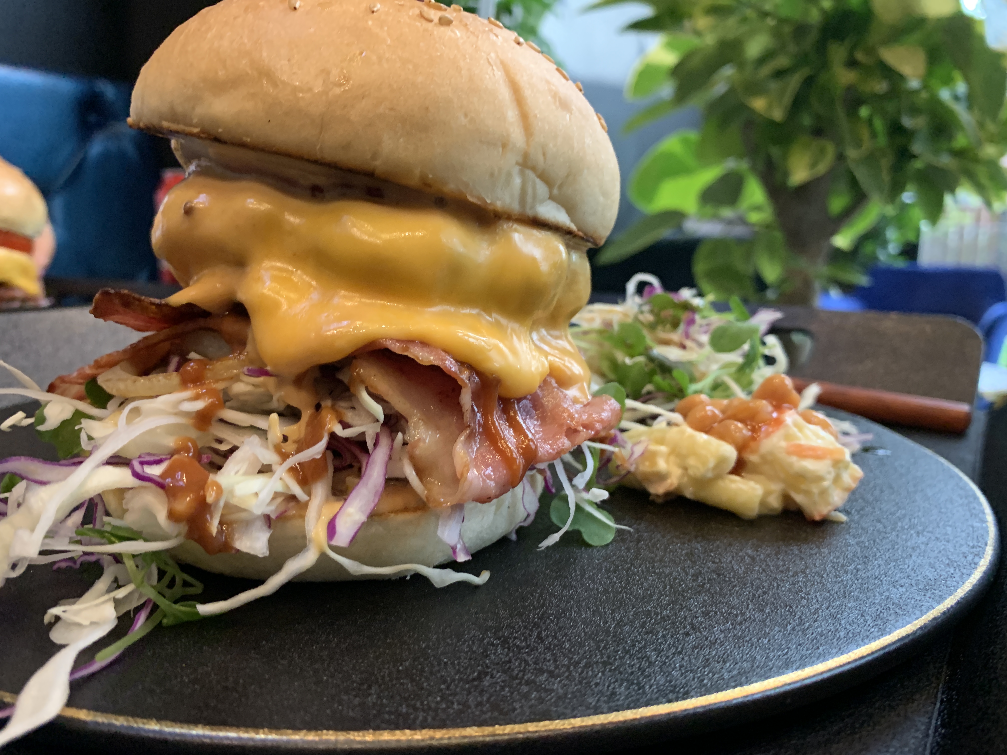 수제버거는 베이컨과 수제 패티를 기반으로 살짝 녹아내린 치즈가 잘 어울어져 있다.