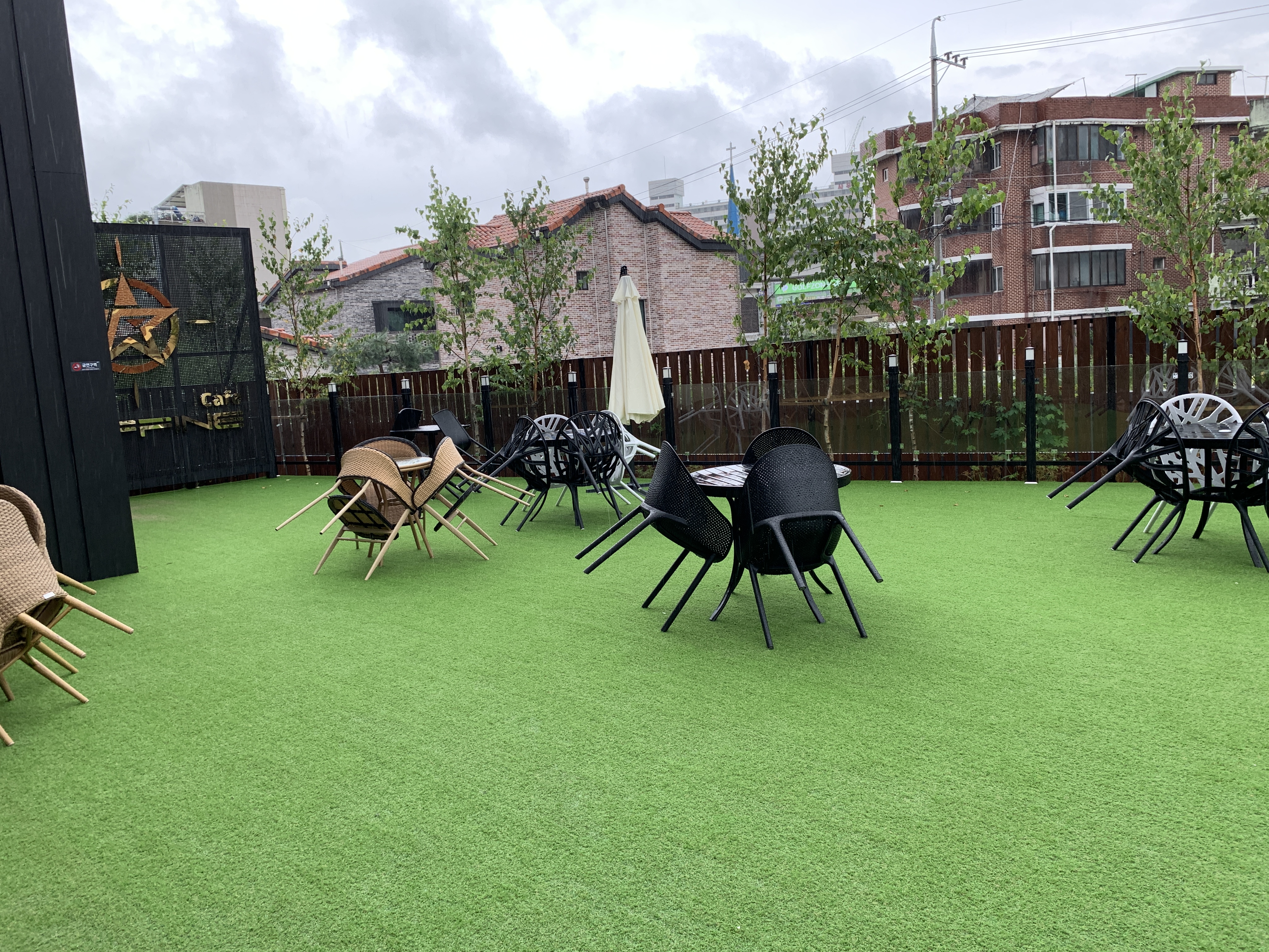 이 날은 비가 너무 많이 오는 관계로 밖에서 커피를 마시지 못했지만 한적한 동내에서 마당에서 마시는 듯한 느낌을 주는 외부 공간도 또한 상당히 만족스럽다. 개인적으로 관리는 힘들겠지만 인조잔디가 아닌 실제 잔디를 깔아뒀으면 전원주택의 마당 같은 느낌을 줄듯하고 여기서 가끔 BBQ 파티 겸 펍을 함께 운영하면 좋을듯한 느낌을 주고 있다.