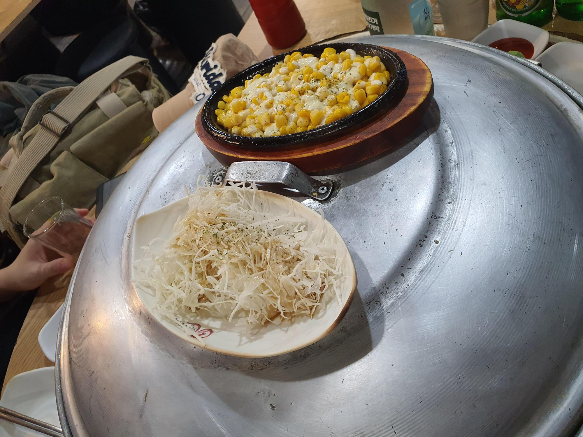 특이하게 조개 전골은 커다란 솥(?) 같은 곳에 나오고 소주를 시키면 양배추 샐러드와 마요네즈와 콘을 구운 기본 안주가 나와서 소주 한잔을 하기에 좋다.