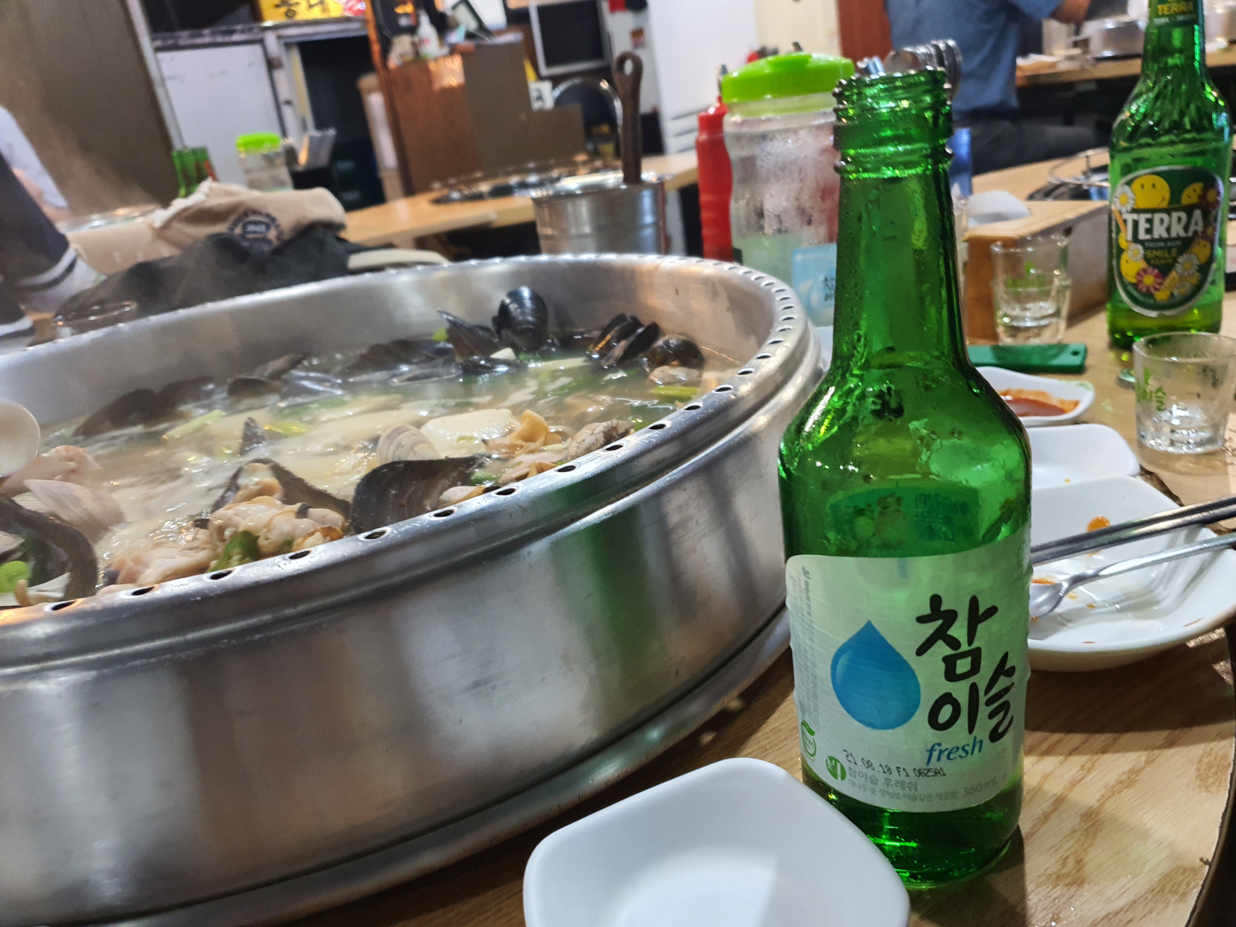 특이하게 조개 전골은 커다란 솥(?) 같은 곳에 나오고 소주를 시키면 양배추 샐러드와 마요네즈와 콘을 구운 기본 안주가 나와서 소주 한잔을 하기에 좋다.
