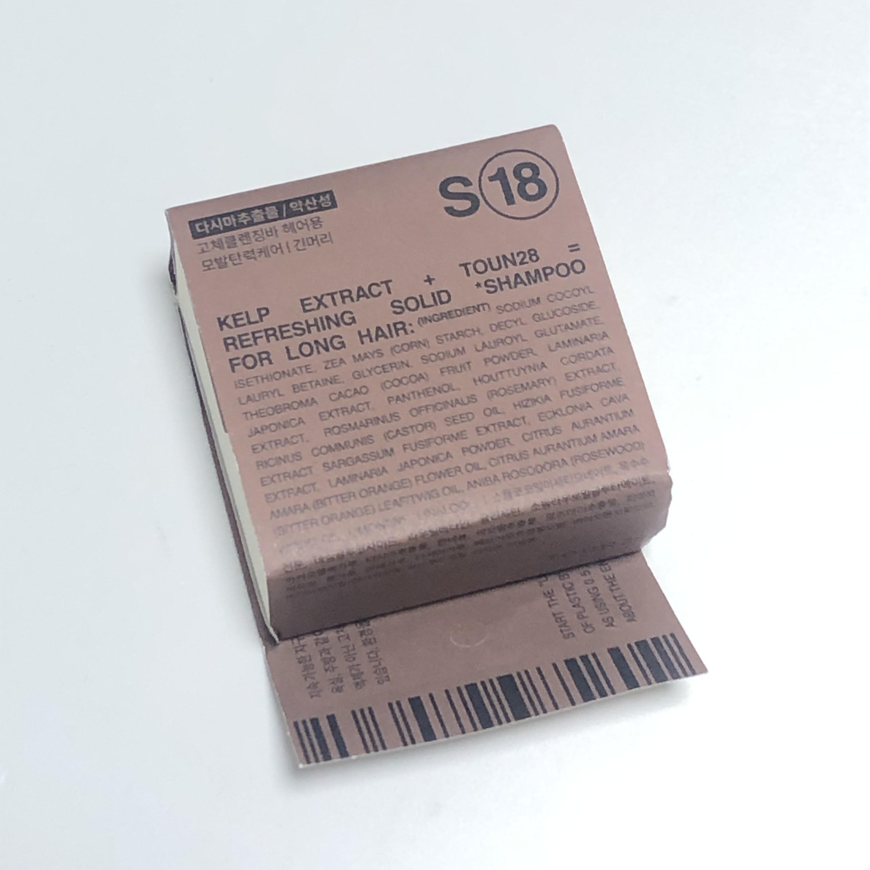 내가 사용한 톤28 샴푸바는 S18 ‘다시마 추출물’로 알긴산, 단백질, 미네랄이 풍부한 다시마 추출물을 그대로 넣어 중/지성용 모발탄력 케어를 위한 약산성 성분의 제품이라고 한다.