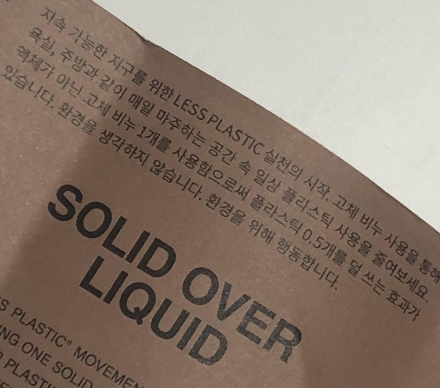 종이 띠 형태의 포장지를 제거하고나면 다시 종이 상자 안에 고체바가 들어가있다. 친환경 제품 답게 모든 포장이 종이로 되어있어서 뜯기도, 버리기도 편하고 플라스틱 쓰레기를 만들지 않았다는점에서 마음도 편했다.