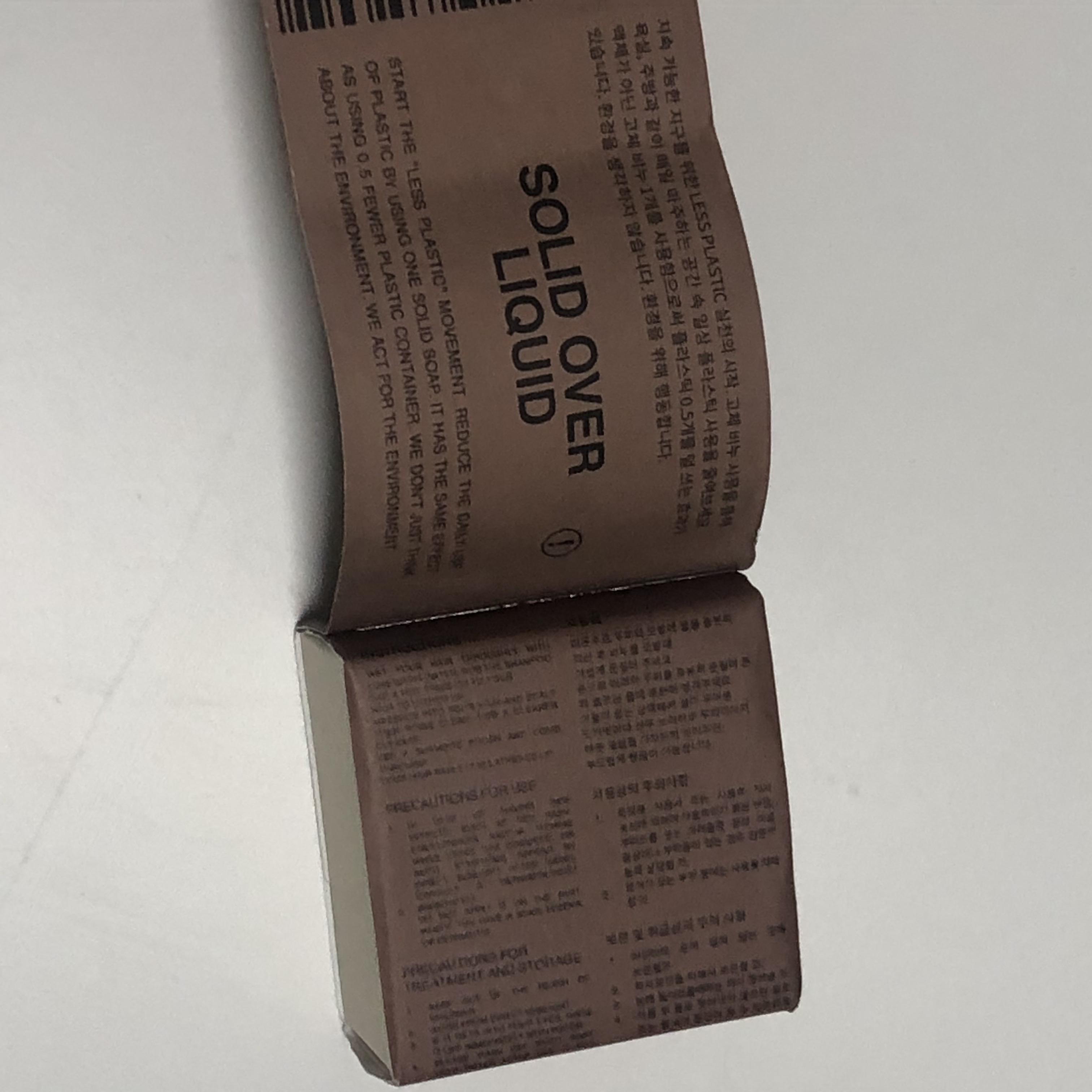 종이 띠 형태의 포장지를 제거하고나면 다시 종이 상자 안에 고체바가 들어가있다. 친환경 제품 답게 모든 포장이 종이로 되어있어서 뜯기도, 버리기도 편하고 플라스틱 쓰레기를 만들지 않았다는점에서 마음도 편했다.