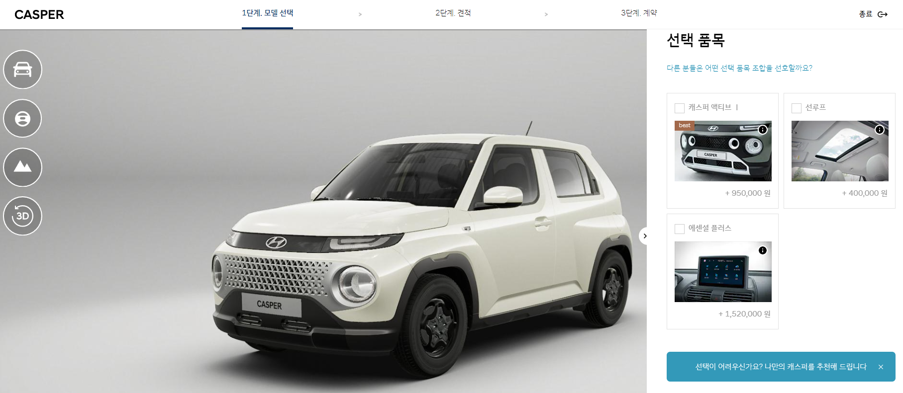 캐스퍼 온라인 웹사이트에서 현대 캐스퍼 가격 및 사양 등과 같은 차량 정보를 이미지, 영상과 함께직접 확인할 수 있으며, 3D컨피규레이터를 통해 실시간으로 원하는 사양이 적용된 차량의 내·외장 디자인을 생동감있게 확인 할 수 있다. 또한 출고 빅 데이터를 활용한 연령, 성별에 따른 캐스퍼 사양 추천 서비스를 제공받아 결정하는데 참고 할 수 있다. 선택 품목을 다 선택하고 나면 하단에 나만의 현대 캐스퍼 가격을 최종적으로 확인할 수 있다)