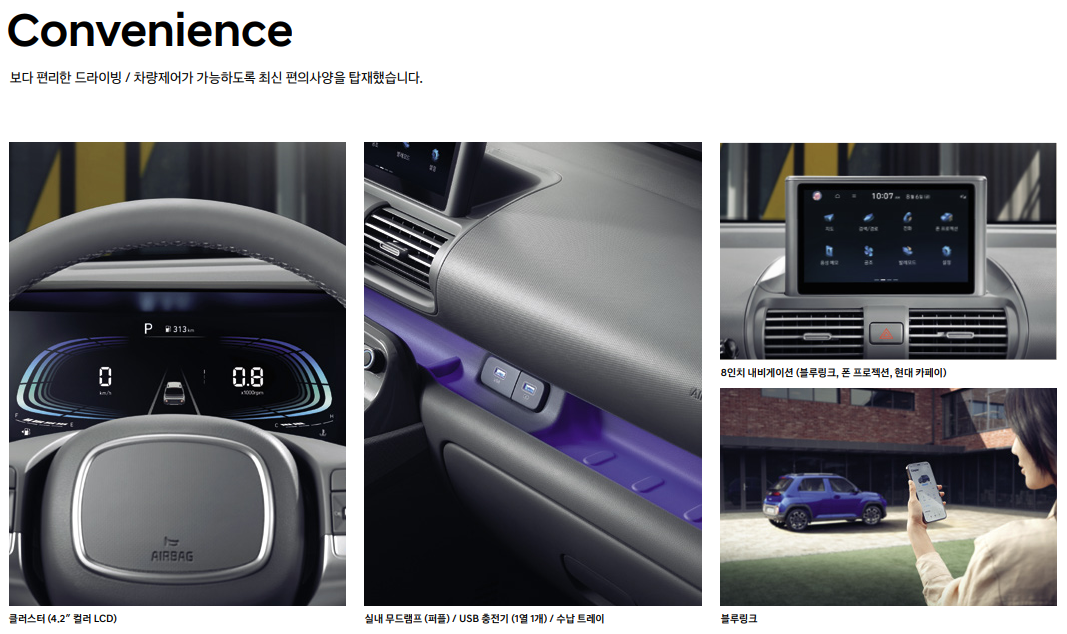 캐스퍼 사양은 편안하고 안정적인 주행 성능은 물론 현대 카페이, 서버기반 음성 인식 차량 제어 등 운전자 편의에 중심을 두어 뛰어난 상품성을 갖췄다.