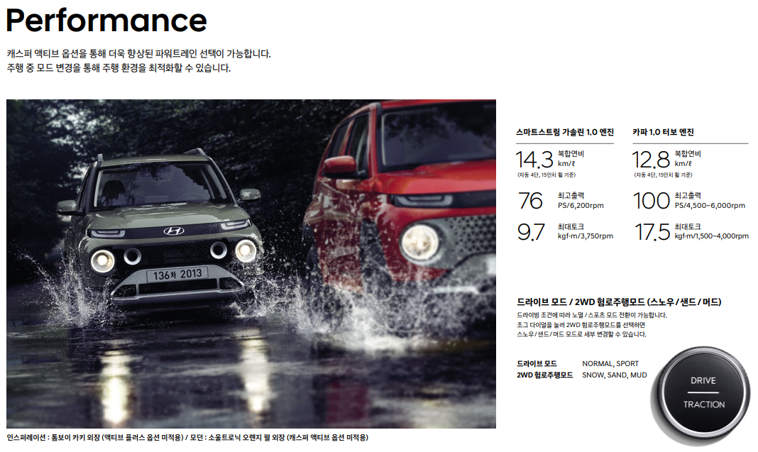 또한 엔트리 SUV 캐 스퍼는 엔진선택 및 주행 모드 변경을 통해 주행환경에 최적화된 차량으로 사용할 수 있다. 1.0MPI가 탑재된 기본 모델과 1.0T-GDI가 탑재된 액티브 모델(터보 모델)을 동시에 운영하며 전 트림에서 액티브 모델 선택이 가능하다. 동급에서 터보 모델을 운영하는 차량은 캐스퍼가 유일하다. 가솔린 1.0은 최고 출력 76PS(마력), 최대 토크 9.7kgf∙m, 복합연비 14.3km/ℓ 를 확보했고, 가솔린 1.0 터보는 100PS, 최대 토크 17.5kgf∙m, 복합연비 12.8km/ℓ의 동력 성능을 갖췄다.