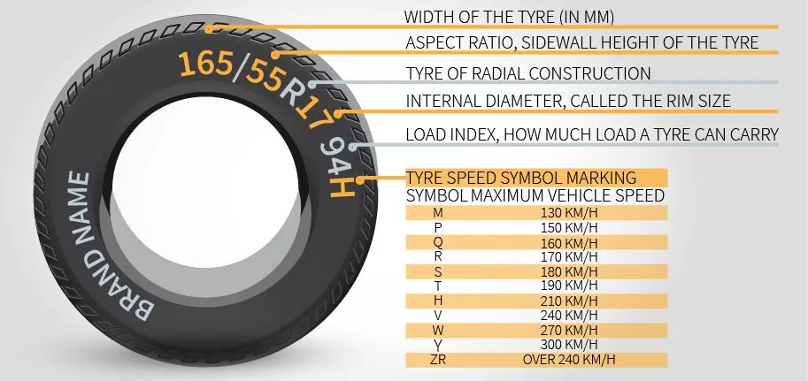 5.타이어 한계속도: 타이어가 주행시 견딜 수 있는 안전한 계속도를 알파벳으로 표시해 놓았다. 각 알파벳이 의미하는 수치는 아래 사진의 표와 같다.