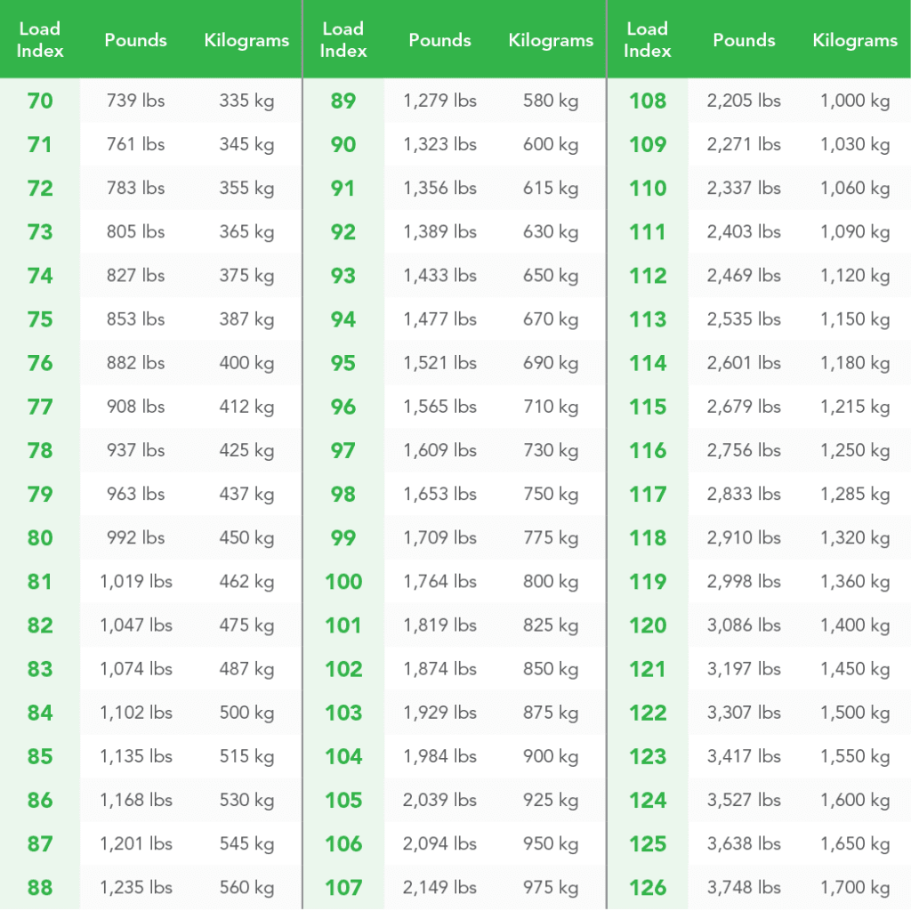 4)한계하중지수: 타이어가 견딜 수 있는 최대 하중 지수 능력을 의미하는 것으로 하중지수에 따른 최대 하중 능력은 아래 표를 참고하면 된다.