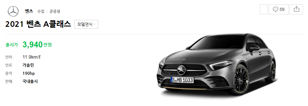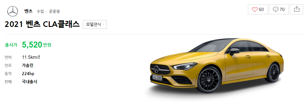 모델명 CLA 45 S AMG로 I4 싱글터보 가솔린 엔진이며 풀타임 4륜구동방식, 자동(DCT) 8단 변속기가 적용 되었다. 또 최대출력 421hp, 연비 9.0km/ℓ로 출시가 7,980만원이다.