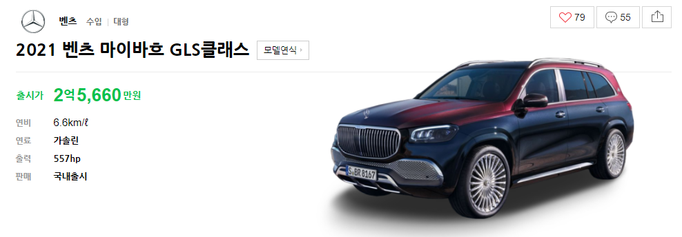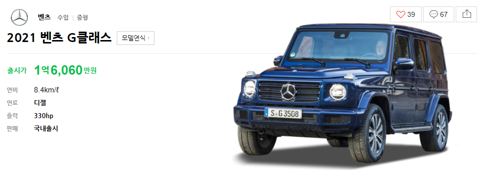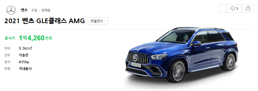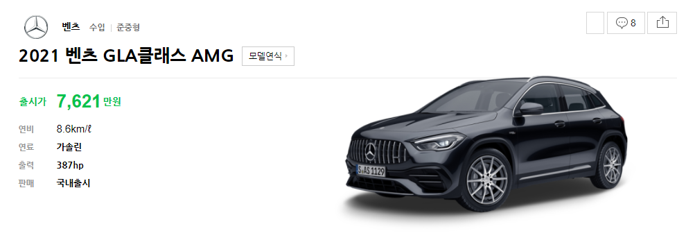 모델명은 GLB 35 AMG로 I4 싱글터보 엔진 사용, 풀타임 4륜구동, 자동(DCT) 8단 변속기가 적용 되어있다. 또 최대출력 306hp, 연비 9.5km/ℓ로 출시가 6,921만원이다.