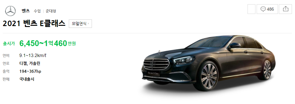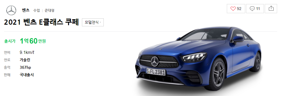 모델명 E 300 e 4MATIC으로 I4 싱글터보 엔진이며 풀타임 4륜구동, 자동 9단 변속기가 적용되어있다. 또 최대출력 211hp으로 출시가 8,390만원이다.