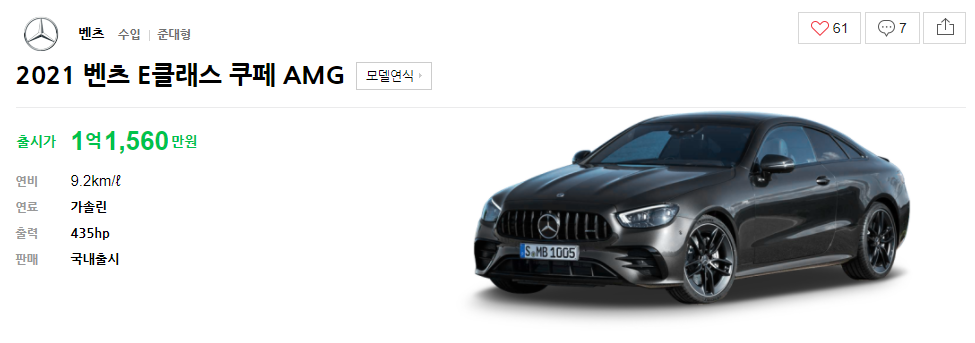 E클래스 벤츠 쿠페 AMG 모델은 모델명 E53 AMG로 I6 트윈 터보 가솔린 엔진에 풀타임 4륜구동 방식, 자동 9단 변속기가 적용 되었으며, 최대출력 435hp, 연비 9.2km/ℓ로 출시가 1억 1,560만원이다.