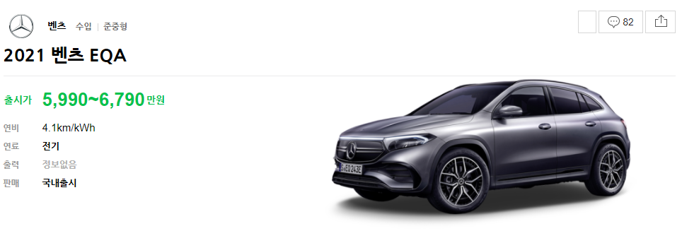 모델명은 EQA 250으로 전륜구동방식, 자동 1단 변속기가 적용되었으며, 모터 최대출력 140.0km, 연비 4.1km/kWh로 출시가(벤츠 가격) 5,990~6,790만원이다.