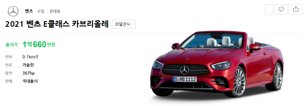 E클래스 컨버터블 세단, 스포츠카 모델로 모델명 E450이다. 제원을 살펴보면 I6 트윈터보 가솔린 엔진으로 풀타임 4륜구동, 자동 9단 변속기가 적용 되었으며, 최대출력 367hp, 연비 9.1km/ℓ로 출시가 1억 660만원이다.