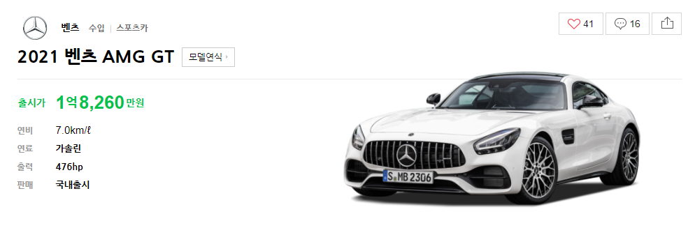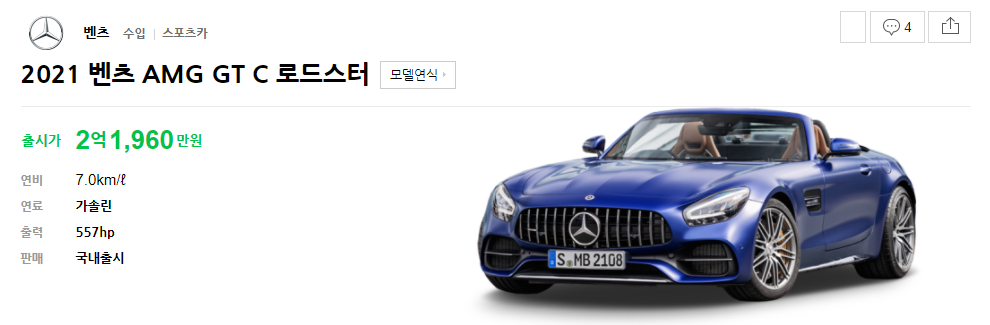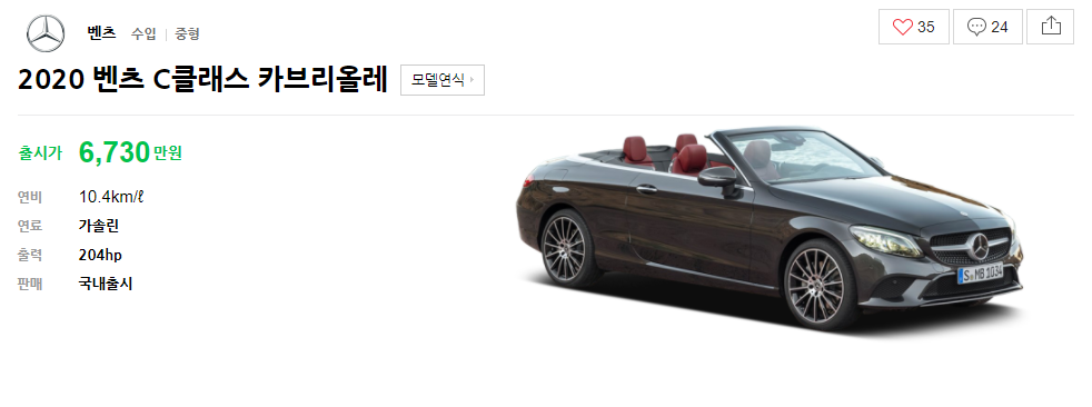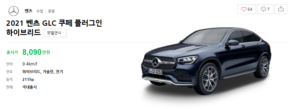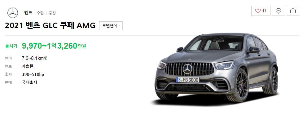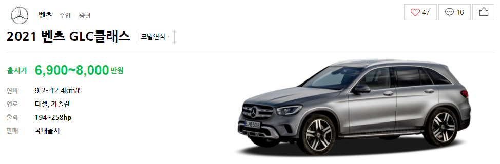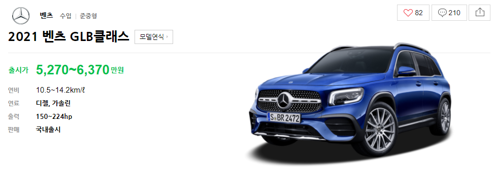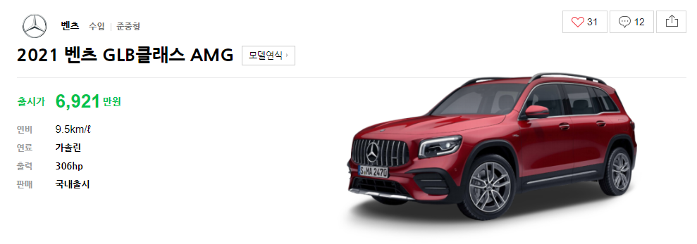 모델명은 GLB 35 AMG로 I4 싱글터보 엔진 사용, 풀타임 4륜구동, 자동(DCT) 8단 변속기가 적용 되어있다. 또 최대출력 306hp, 연비 9.5km/ℓ로 출시가 6,921만원이다.