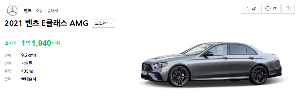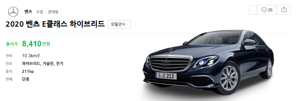 모델명 E 300 e 4MATIC으로 I4 싱글터보 엔진이며 풀타임 4륜구동, 자동 9단 변속기가 적용되어있다. 또 최대출력 211hp으로 출시가 8,390만원이다.