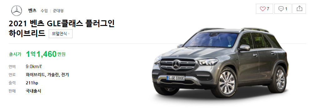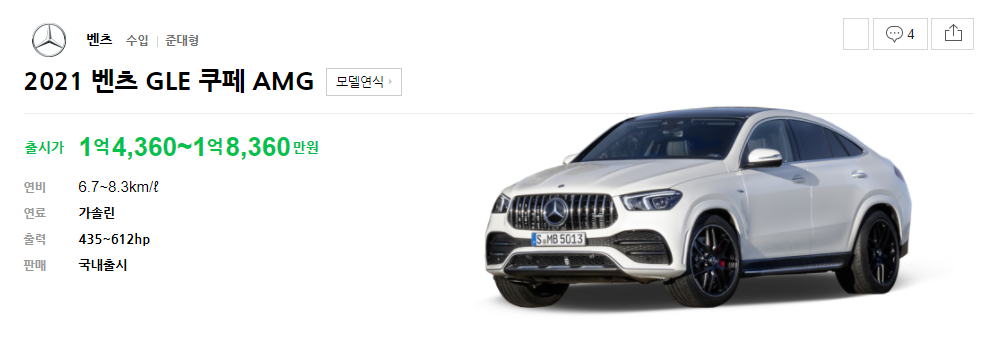 모델명은 GLE350e 4MATIC으로 I4직분사 싱글터보 엔진형식이며, 풀타임 4륜구동, 자동9단 변속기가 적용된다. 또 최대출력 211hp 연비 9.0km/ℓ로 출시가 1억 1,460만원이다.