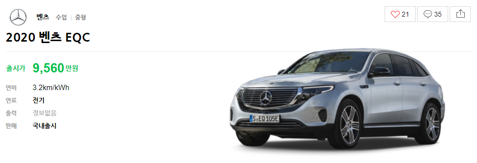 모델명은 EQC로 최대출력 304.0Kw, 연비 3.2km/kWh로 출시가 9,560만원이다.