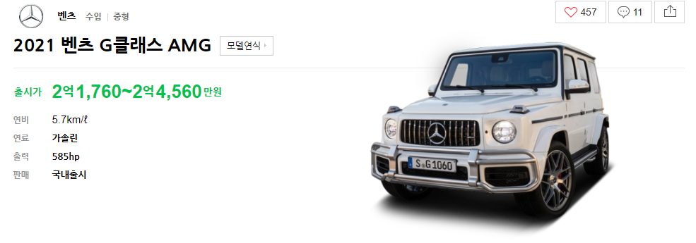 G클래스의 고성능 버전 차량으로 모델명 G 63 AMG이며, V8 트윈터보 가솔린 엔진이다. 풀타임 4륜구동, 자동9단 변속기가 탑재 되어있으며, 최대출력 585hp, 연비 5.7km/ℓ로 출시가 2억 1,760~2억4,560만원이다.