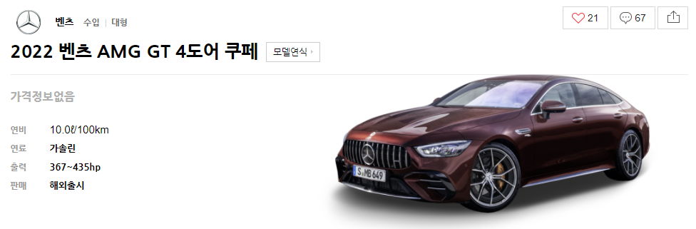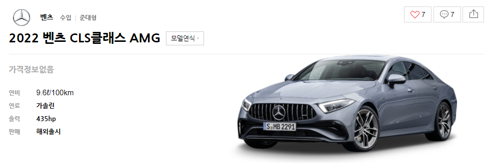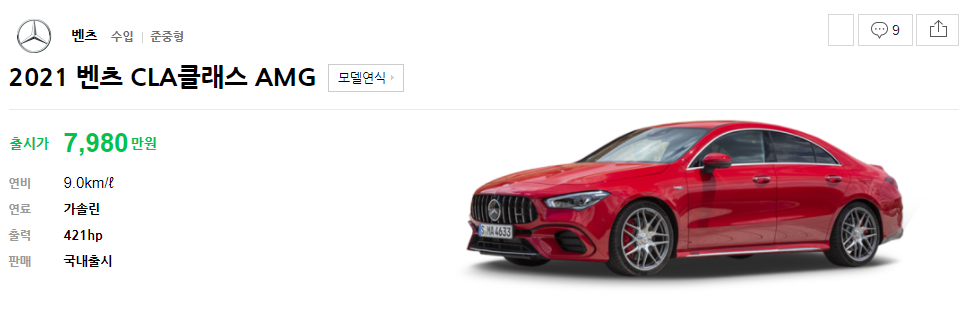 모델명 CLA 45 S AMG로 I4 싱글터보 가솔린 엔진이며 풀타임 4륜구동방식, 자동(DCT) 8단 변속기가 적용 되었다. 또 최대출력 421hp, 연비 9.0km/ℓ로 출시가 7,980만원이다.