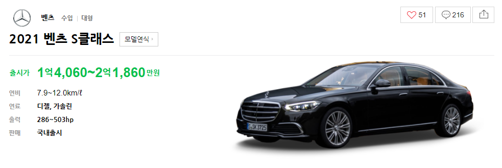 S클래스는 디젤엔진 모델 S 350d / S 400d 4MATIC 과 가솔린 엔진 모델 S 500 4MATIC / S 580 4MATIC 이 있다. S350d를 기준으로 보면 I6 싱글터보 엔진으로 후륜구동, 자동 9단 변속기가 적용 된다. 또 최대출력 286hp, 연비 12.0km/ ℓ로 출시가 1억 4,060만원이다.