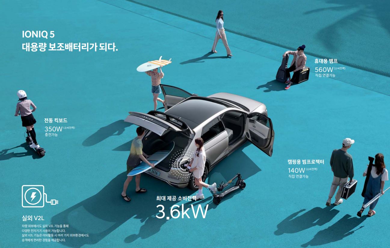 뿐만 아니라 일을 열심히한 N잡러들이 주말에 캠핑이나 다양한 야외 활동을 할 때 큰 도움을 주는 차량이기도 합니다. 바로 아이오닉5에 적용된 V2L 시스템인데요. 전기 자동차의 베터리를 대용량 보조배터리로 이용할 수 있는 기술입니다. 쉽게 이야기하면 전기차 충전하는 포트에 V2L 커넥터를 꼽아주면 언제 어디서든 220V를 사용할 수 있는데요. 휴대용 앰프나 캠핑용 빔프로젝터 심지어 세탁기나 냉장고, 에어컨도 작동할 수 있다고 하니 캠핑을 좋아하시는 N잡러라면 무조건 추천하는 차량입니다.