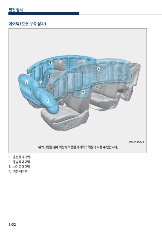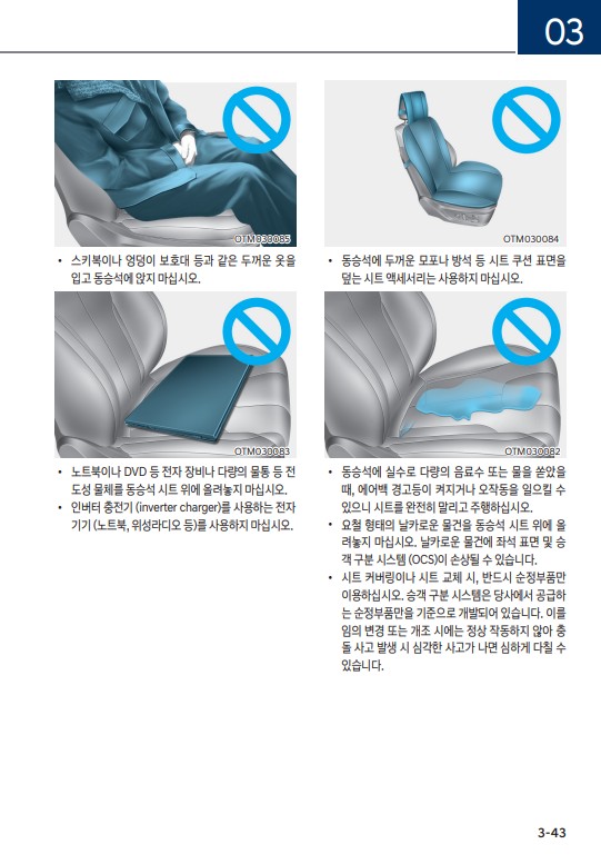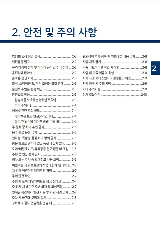 좌석 조절 방법, 안전벨트, 에어백과 같은 안전장치와 관련된 내용들이 정리된 내용이다. 올바른 벨트 사용방법, 어린이 보조시트 이용 방법, 에어백 장치의 구성 및 기능에 대해 자세히 설명 되어 있어 안전을 위해 꼭 숙지해 두는 것이 좋다. 오른쪽 사진은 승객 구분 시스템(OCS)에 대한 주의 사항인데 엉덩이 보호대나 두꺼운 옷을 입는 우, 두꺼운 쿠션 시트 액세서리를 사용하는 경우, 다량의 액체를 쏟았을 경우 시스템이 오작동해 에어백 사용에 문제를 일으킬 수 있다고 한다.