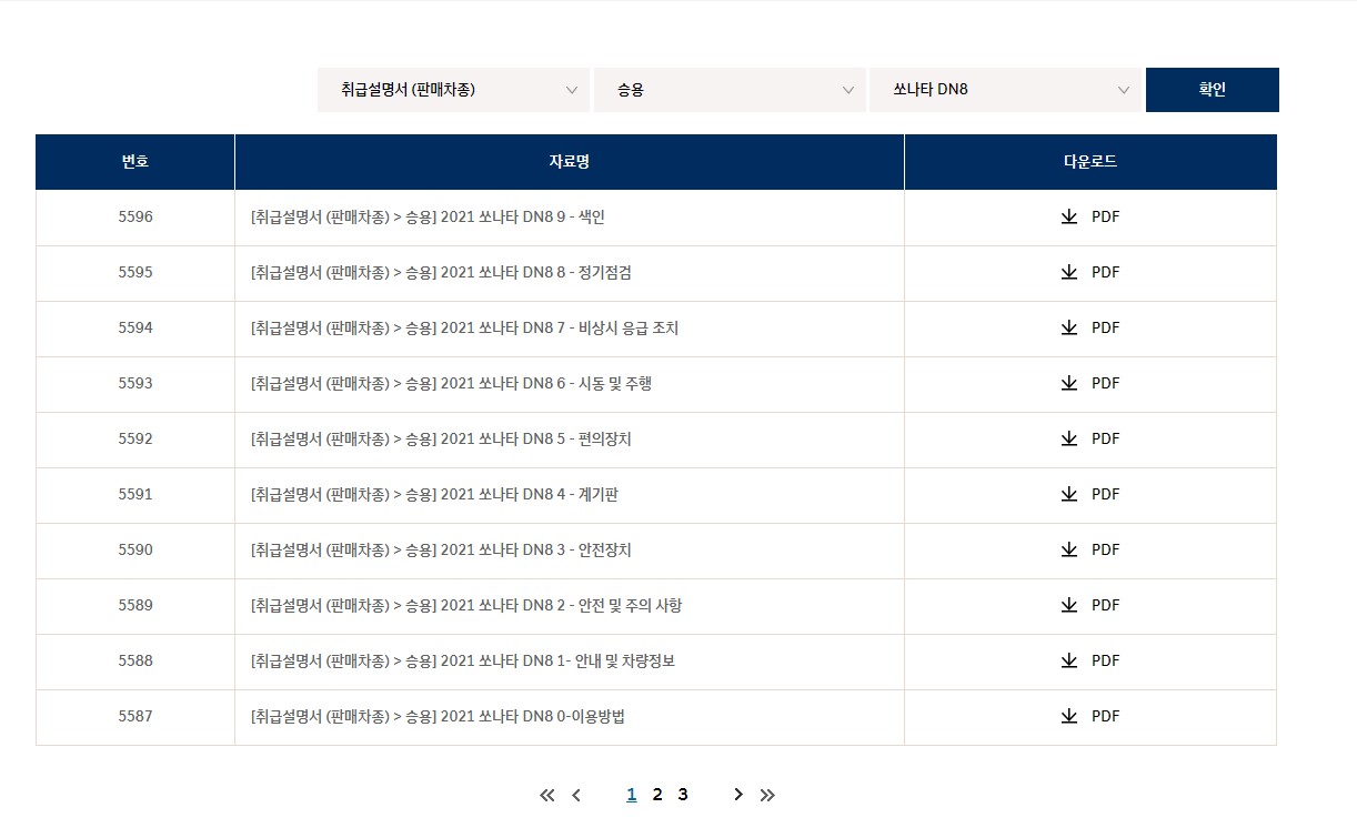 판매차종중 ‘쏘나타DN8’모델을 선택해봤다. 해당 차량의 취급 설명서 색인부터 이용 방법까지 항목별로 구분되어 각각 PDF 파일로 열어보거나 다운받을 수 있다. 3페이지까서 확인해보니 1페이지는 2021년형 쏘나타, 2페이지는 2020년형 쏘나타, 3페이지는 2019년형 쏘나타 취급 설명서로 되어있어 연식을 확인 후 필요한 내용을 참고하면 된다.